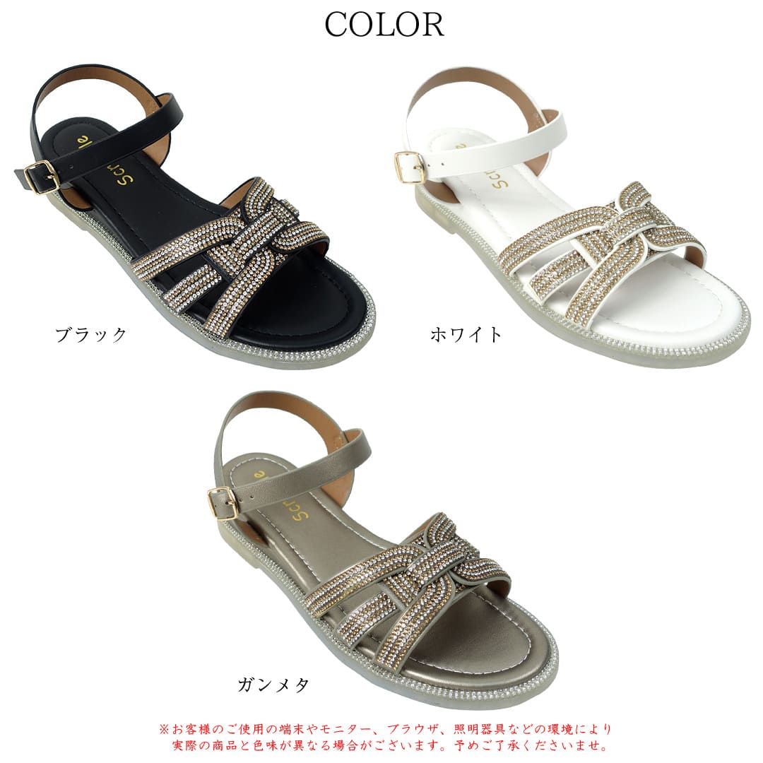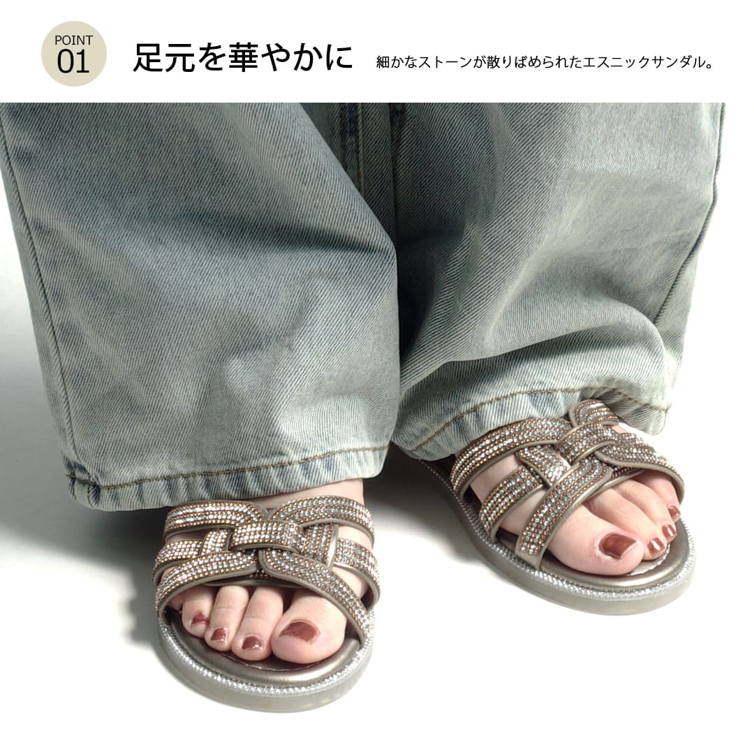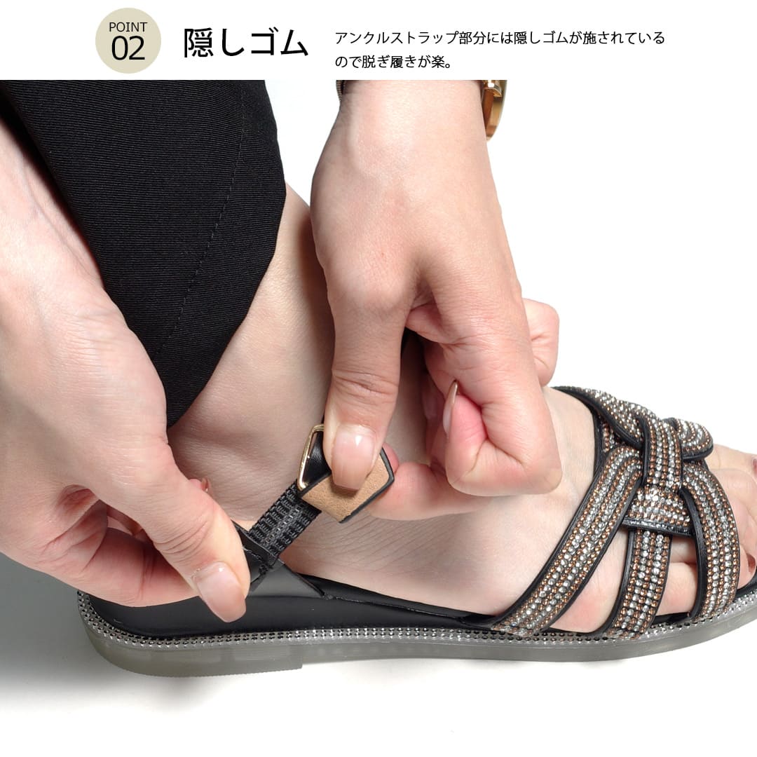 サンダル レディーズ 編み込みビジュー フラット 歩きやすい ぺたんこ 黒