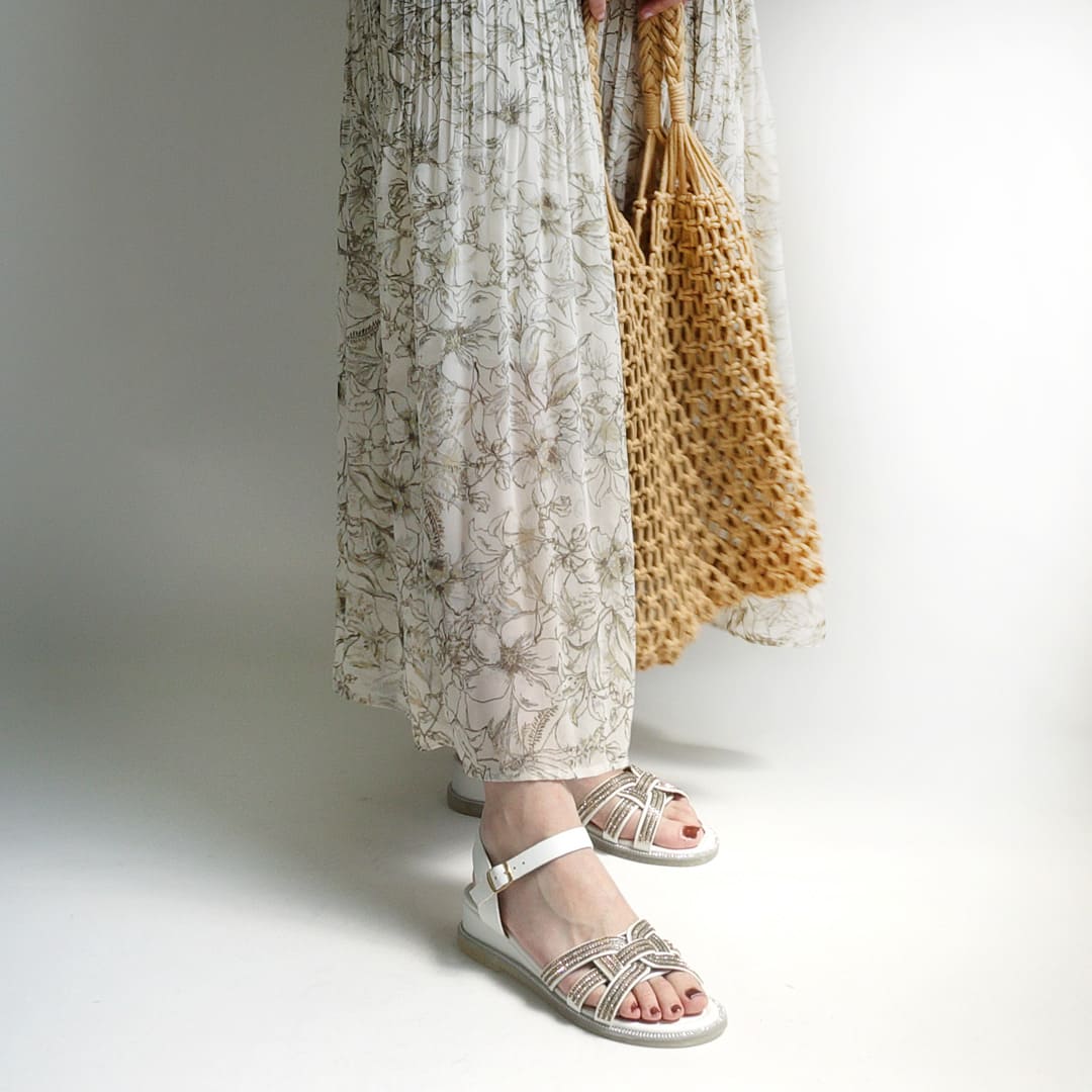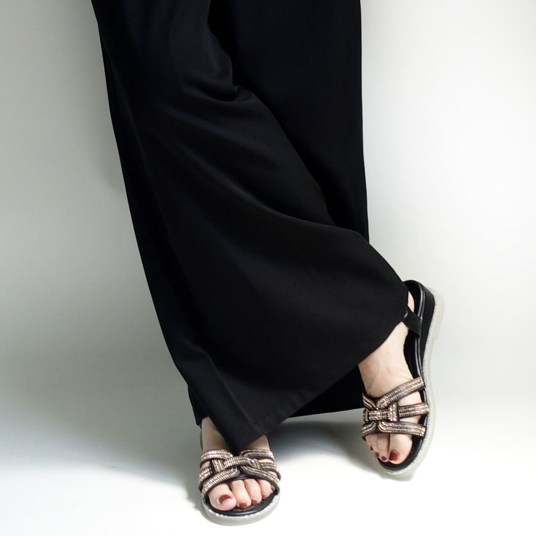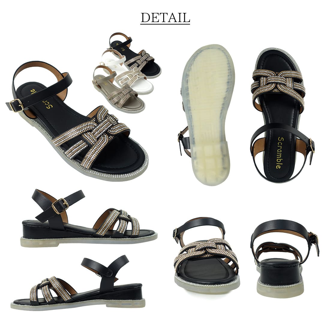 サンダル レディーズ 編み込みビジュー フラット 歩きやすい ぺたんこ 黒