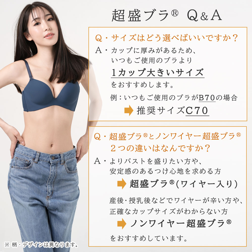 ※カップに厚みがあるデザインのため、普段ご使用のブラジャーよりも1カップ大きめのサイズをおすすめしています。