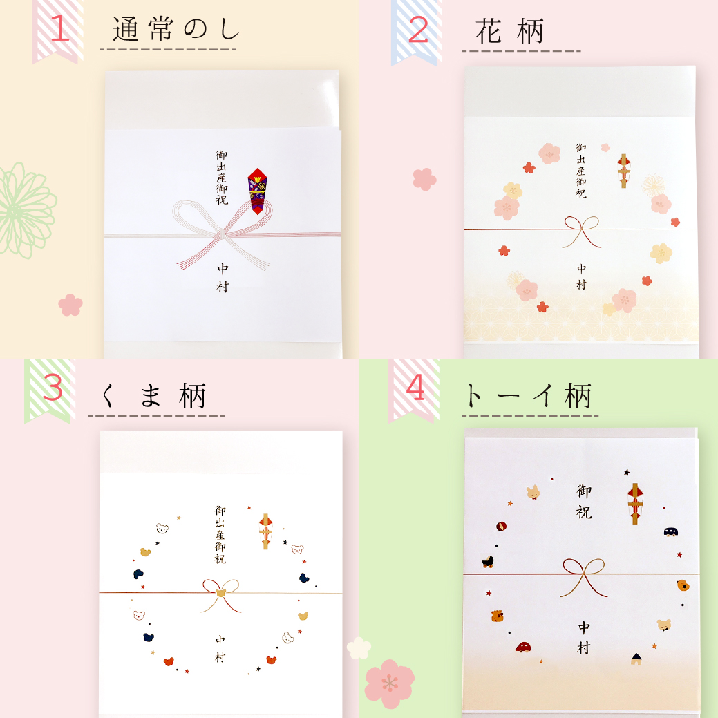 【のし包装】のしを内熨斗でおかけし、オリジナル包装紙でお包みいたします。のしの種類は、一般的なデザインのほかに、赤ちゃんの城の人気柄を揃えたオリジナルデザインもご用意しています。のしの表書きは、「御出産御祝」、「御祝」のほか、空白「素のし」でのお作りもできます。また、内祝やその他ご希望の表書きがある場合には、「その他」をお選びいただき、ご注文の最後の備考欄にご記入ください。