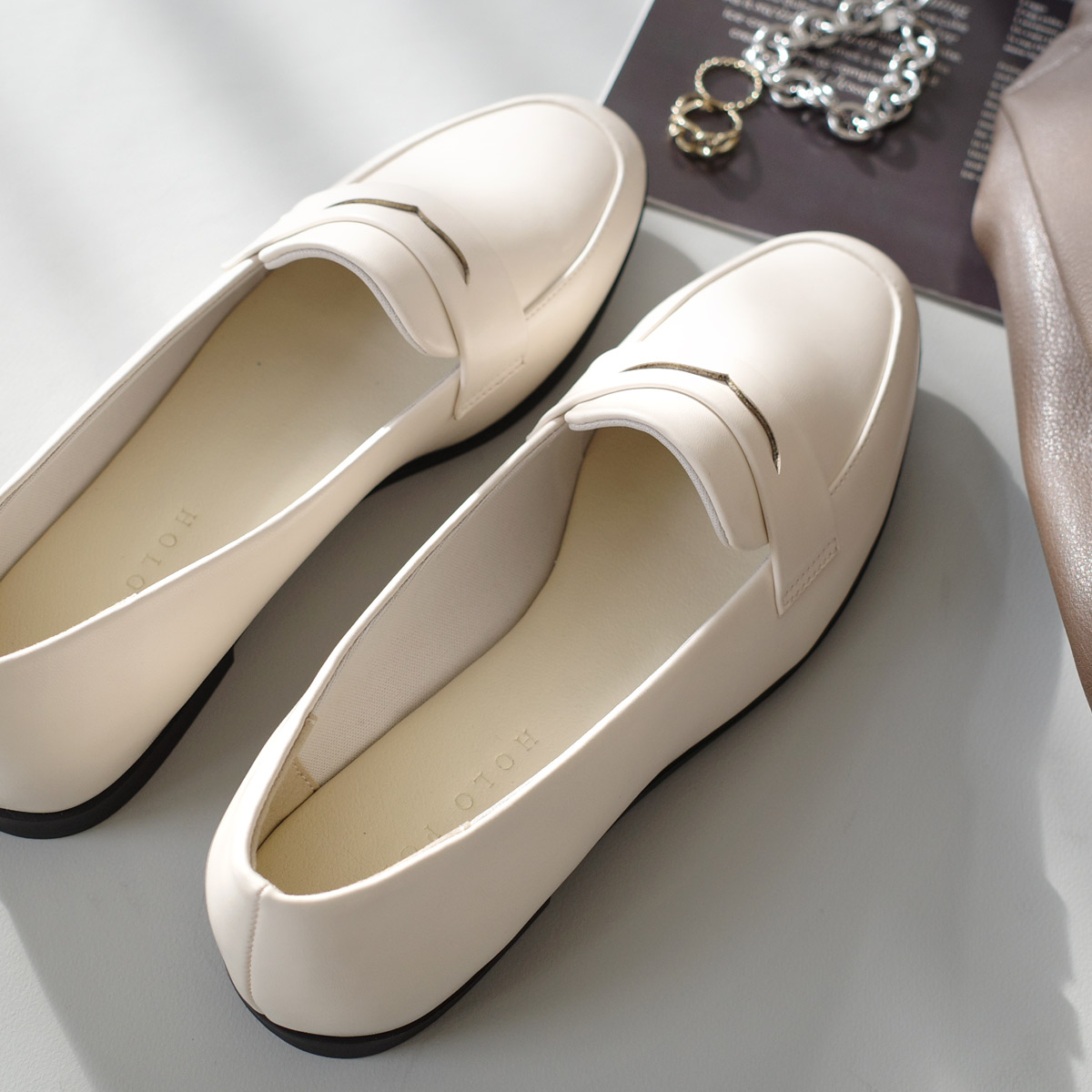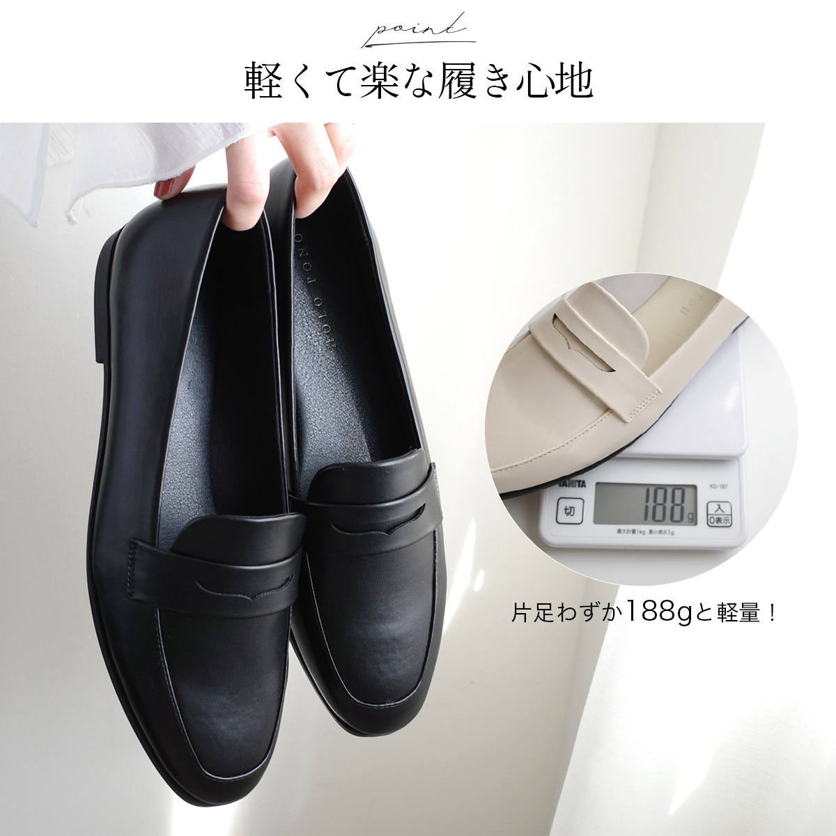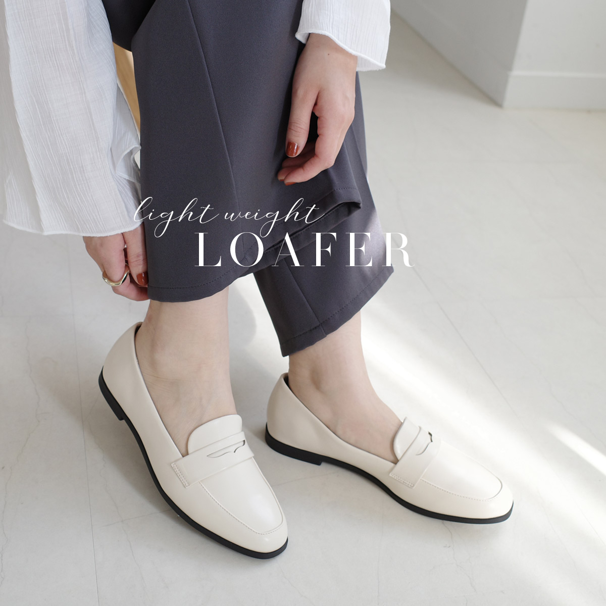 ON/OFF使える飽きのこないミニマルなデザインのコインローファー軽量でやわらかなアッパー素材で履きやすく快適な履き心地。