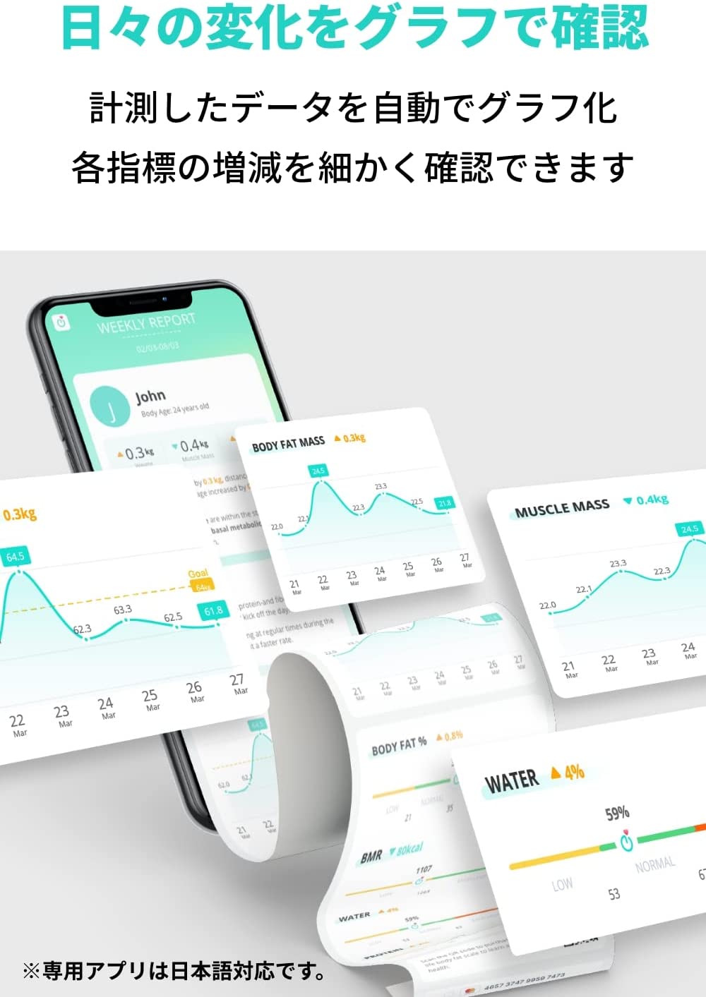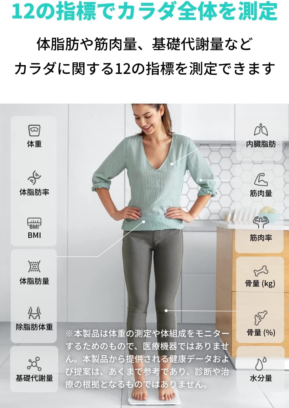 ・本製品は体重の測定や体組成をモニターするためのもので、医療機器ではありません。本製品から提供される健康データおよび提案は、あくまで参考であり、診断や治療の根拠となるものではありません。