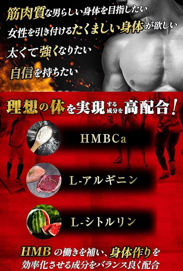 HMBの働きを補い、筋肉質な身体作りを効率化させるLアルギニンやLシトルリンなどの成分をバランス良く配合しました。