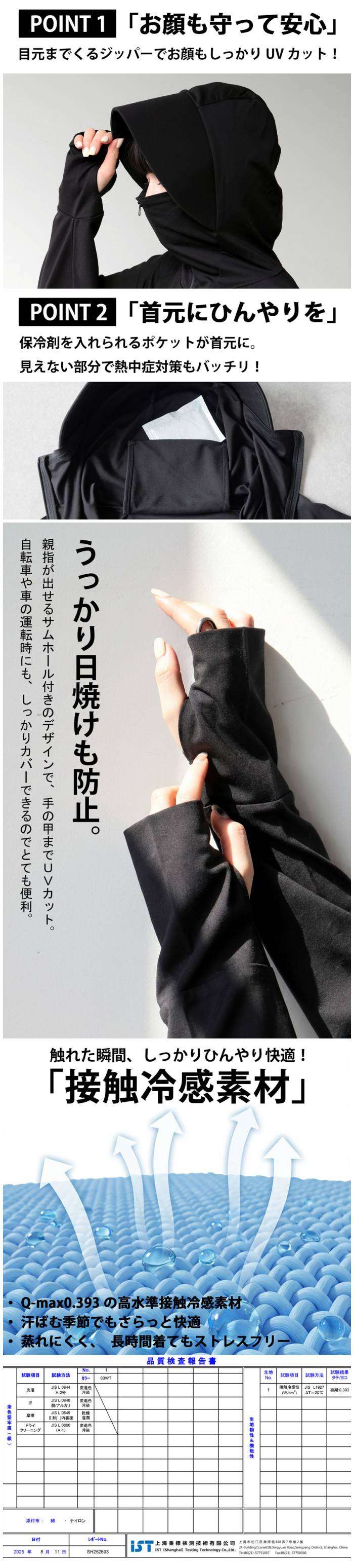 顔まですっぽり覆えるジップアップフードと接触冷感素材で紫外線も暑さもブロック。手の甲までカバーする指穴付き袖や保冷剤対応ポケットで、快適性と機能性を両立した日焼け防止パーカーです。通勤やレジャーに活躍する万能アイテム。