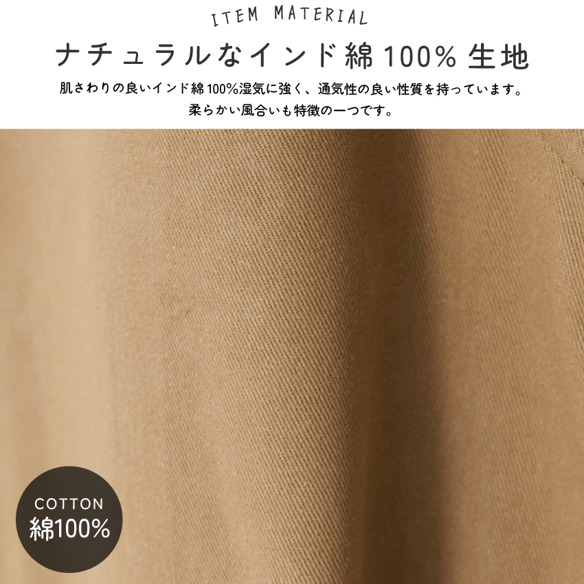 肌さわりの良いインド綿100%湿気に強く、通気性の良い性質を持っています。 柔らかい風合いも特徴の一つです。