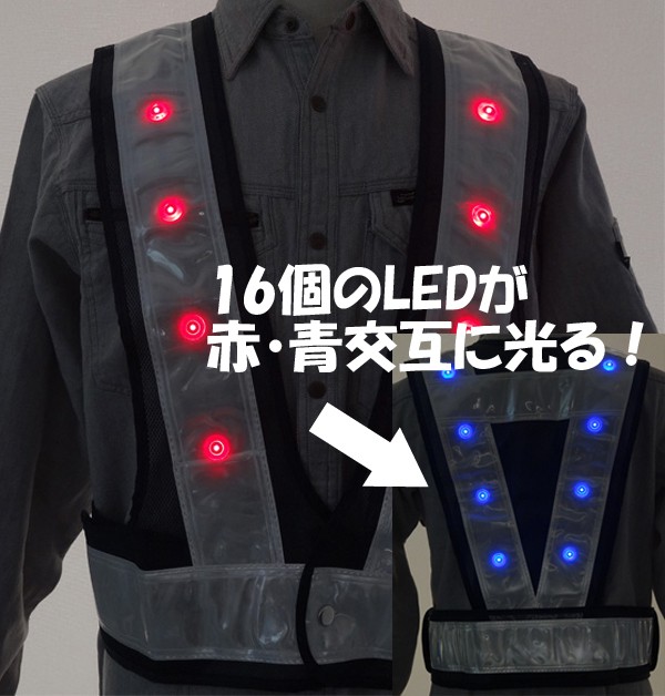 工事現場などでよく見かける作業用LED安全ベストです。今回赤と青LEDが交互に点滅タイプが登場しました!さらに今回のベストは白い反射帯の幅が従来モデルの50mmから70mmに改良されより視認性がUPされております!