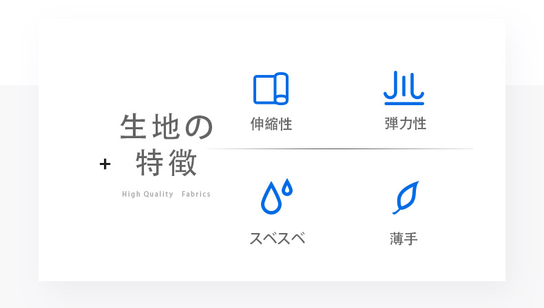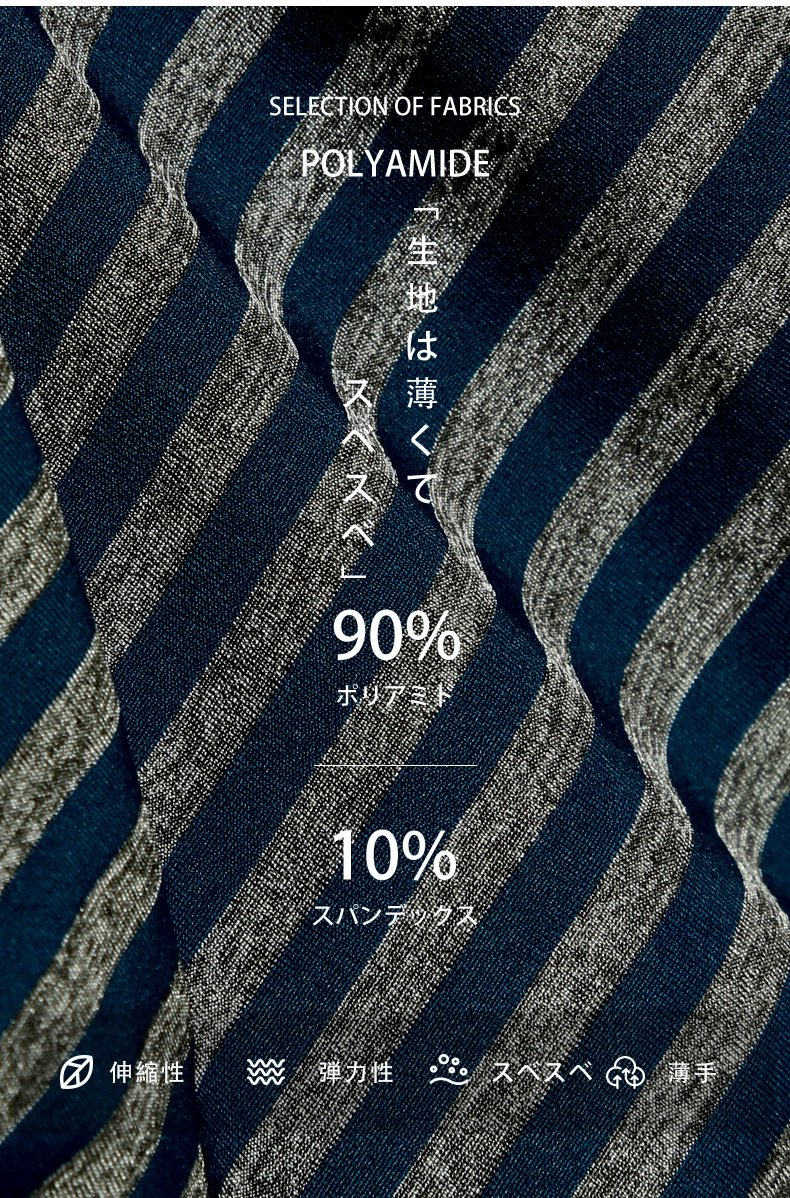 生地は薄くてスベスベ、よく伸縮するポリアミド生地を使用。色落ちや型崩れしづらく、お手入れが簡単です。