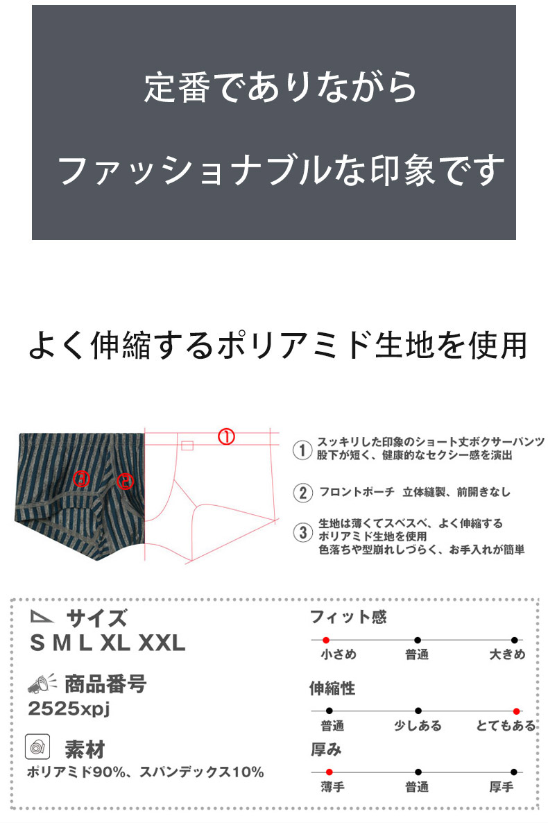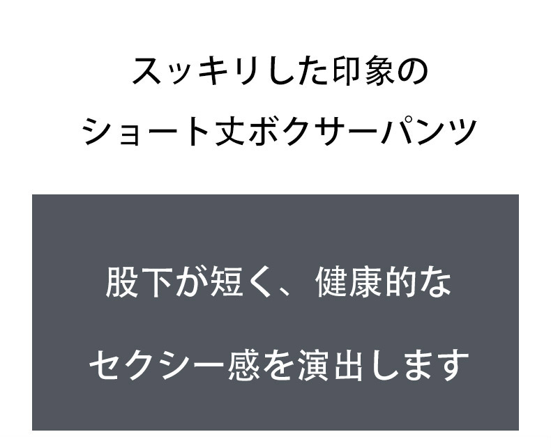 スッキリした印象のショート丈ボクサーパンツです。股下が短く、健康的なセクシー感を演出します。