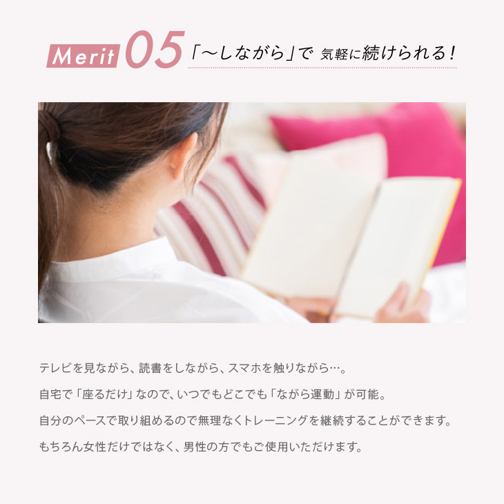 テレビを見ながら、読書をしながら、スマホを触りながら…。自宅で「座るだけ」なので、いつでもどこでも「ながら運動」が可能。自分のペースで取り組めるので無理なくトレーニングを継続することができます。