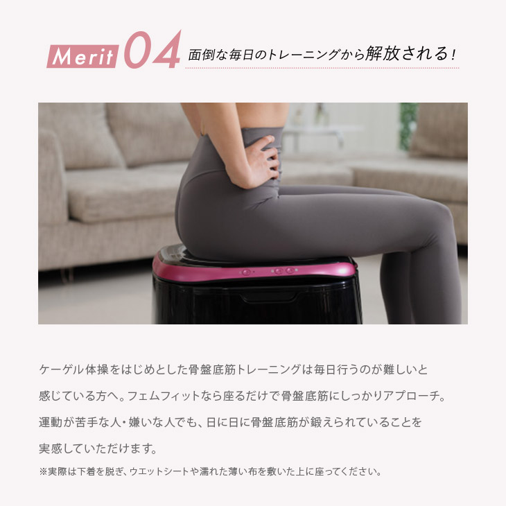 ケーゲル体操をはじめとした骨盤底筋トレーニングは毎日行うのが難しいと感じている方へ。フェムフィットなら座るだけで骨盤底筋にしっかりアプローチ。運動が苦手な人・嫌いな人でも、日に日に骨盤底筋が鍛えられていることを実感していただけます。