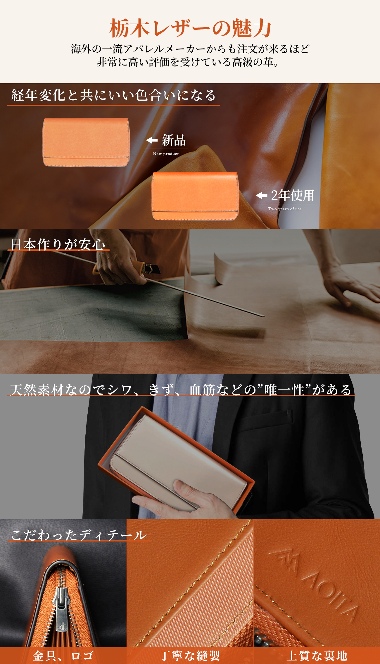日本製栃木レザーを使用。グレージング加工により艶と強度を高め、使うほどに味わいが増します。