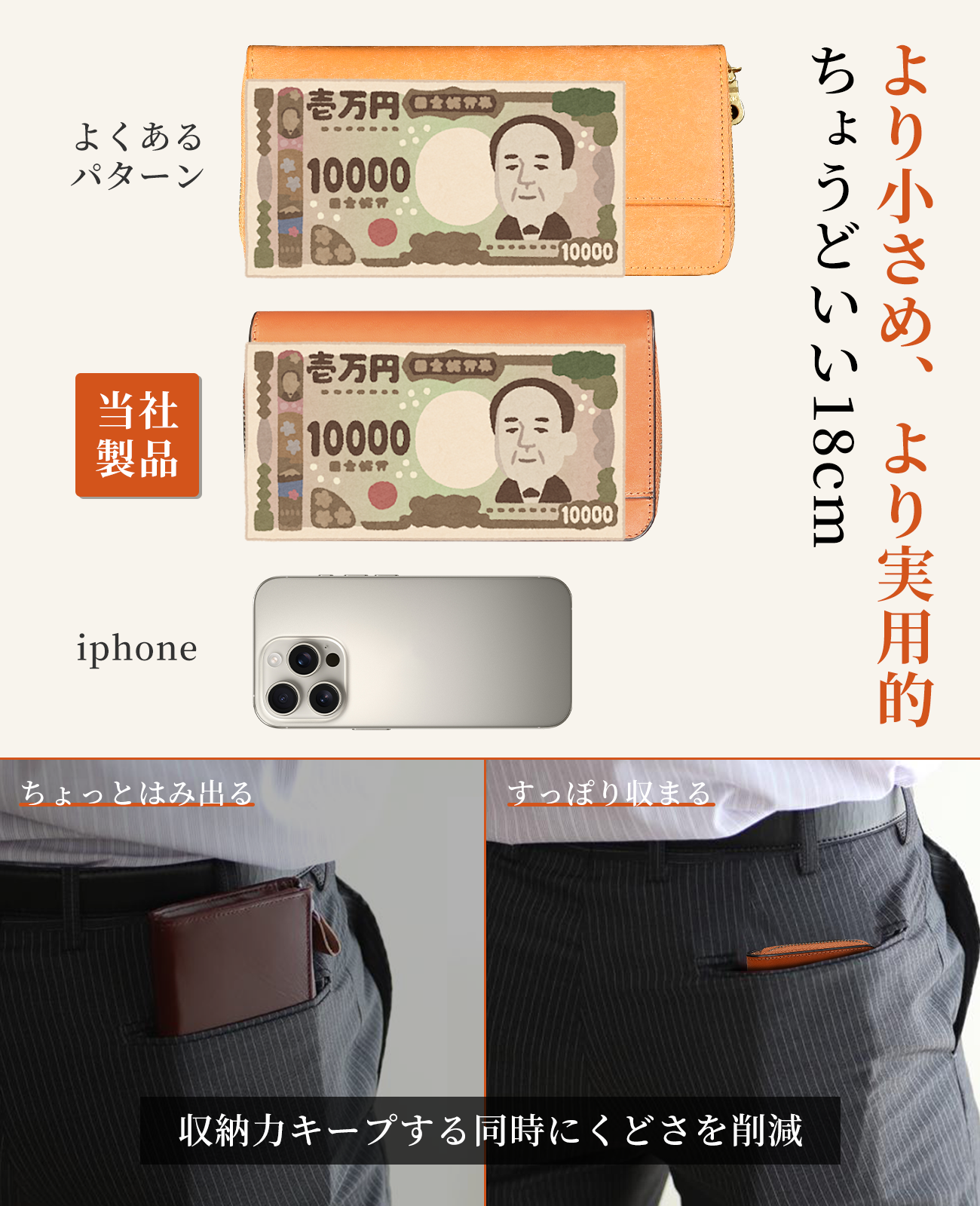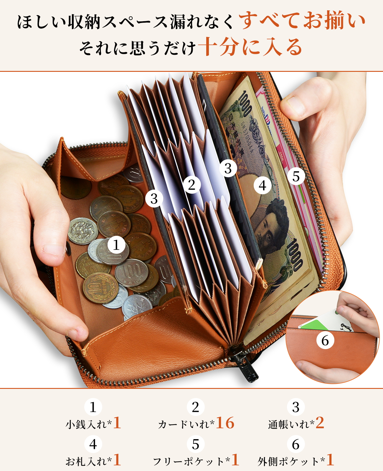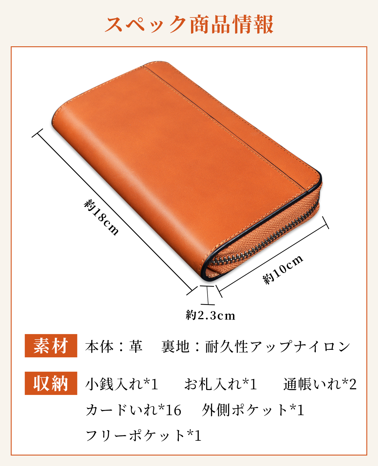 カード16、通帳ポケット2、ボックス型小銭入れ、外ポケット付き。サイズ約18×10×2.3cmで、かさばりにくい設計。