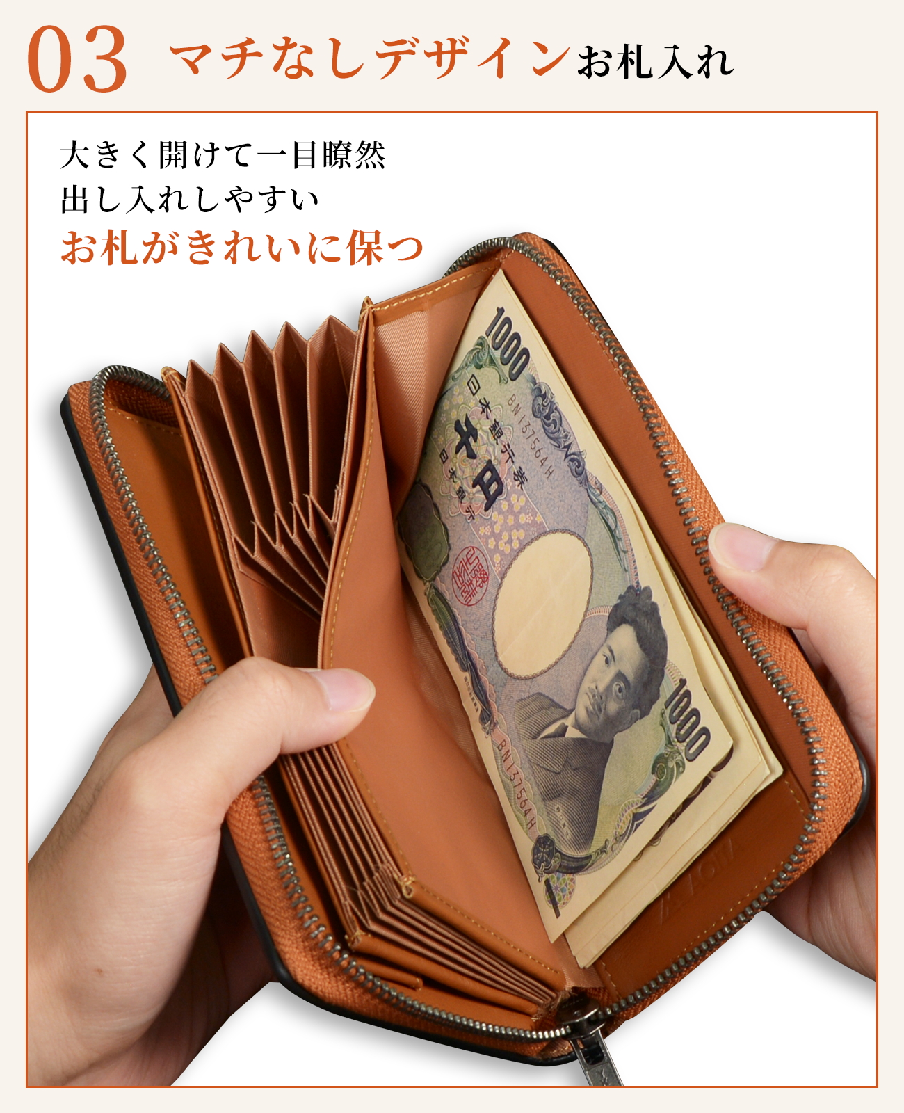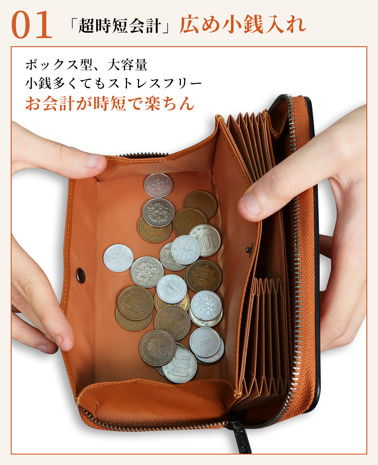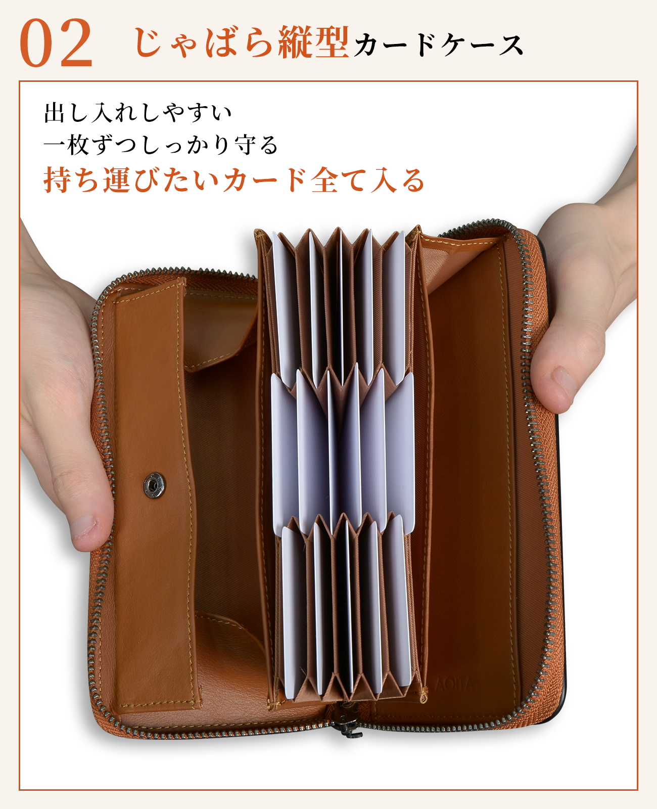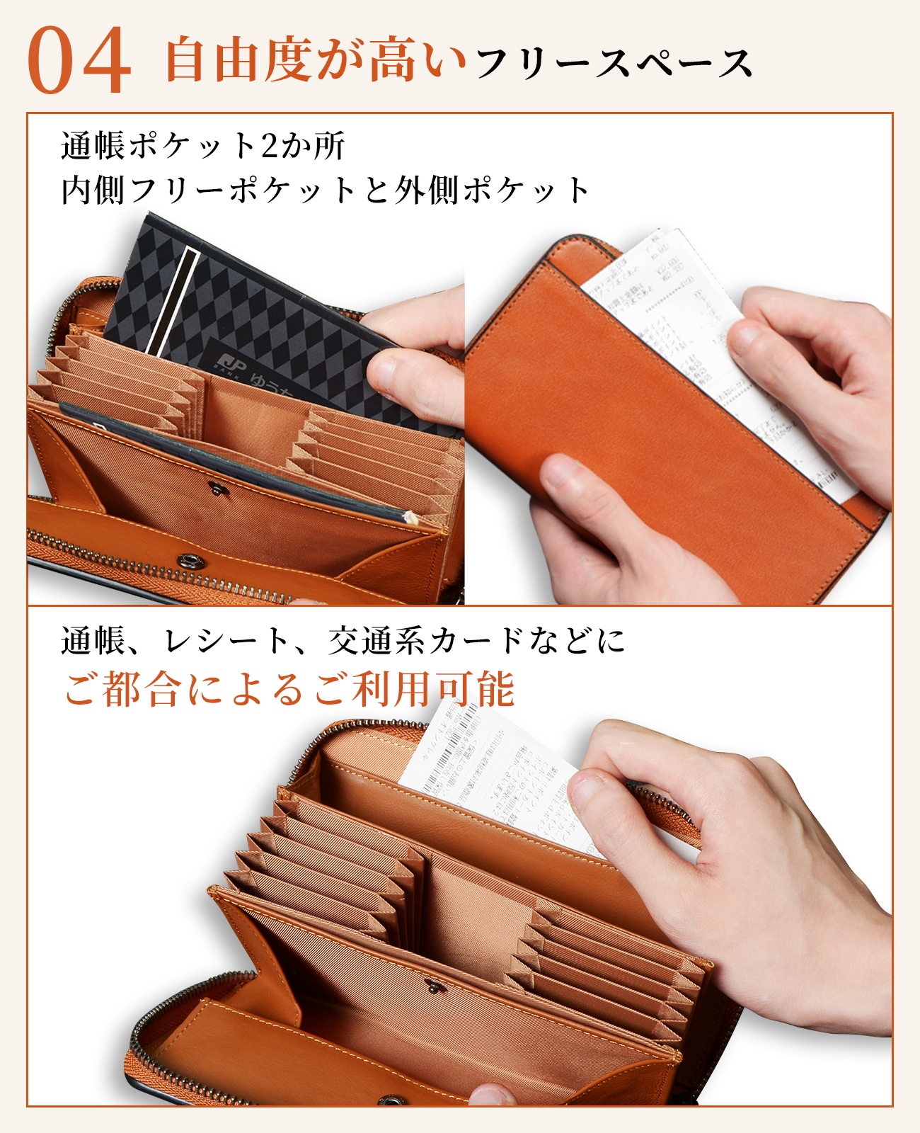 じゃばら式カード収納で決済がスムーズ。通帳・現金・小物の整理にも便利。外側カードポケット付き。