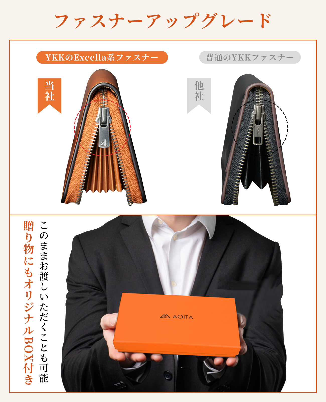 最高級EXCELLAファスナーを採用。滑らかな開閉と高い耐久性。