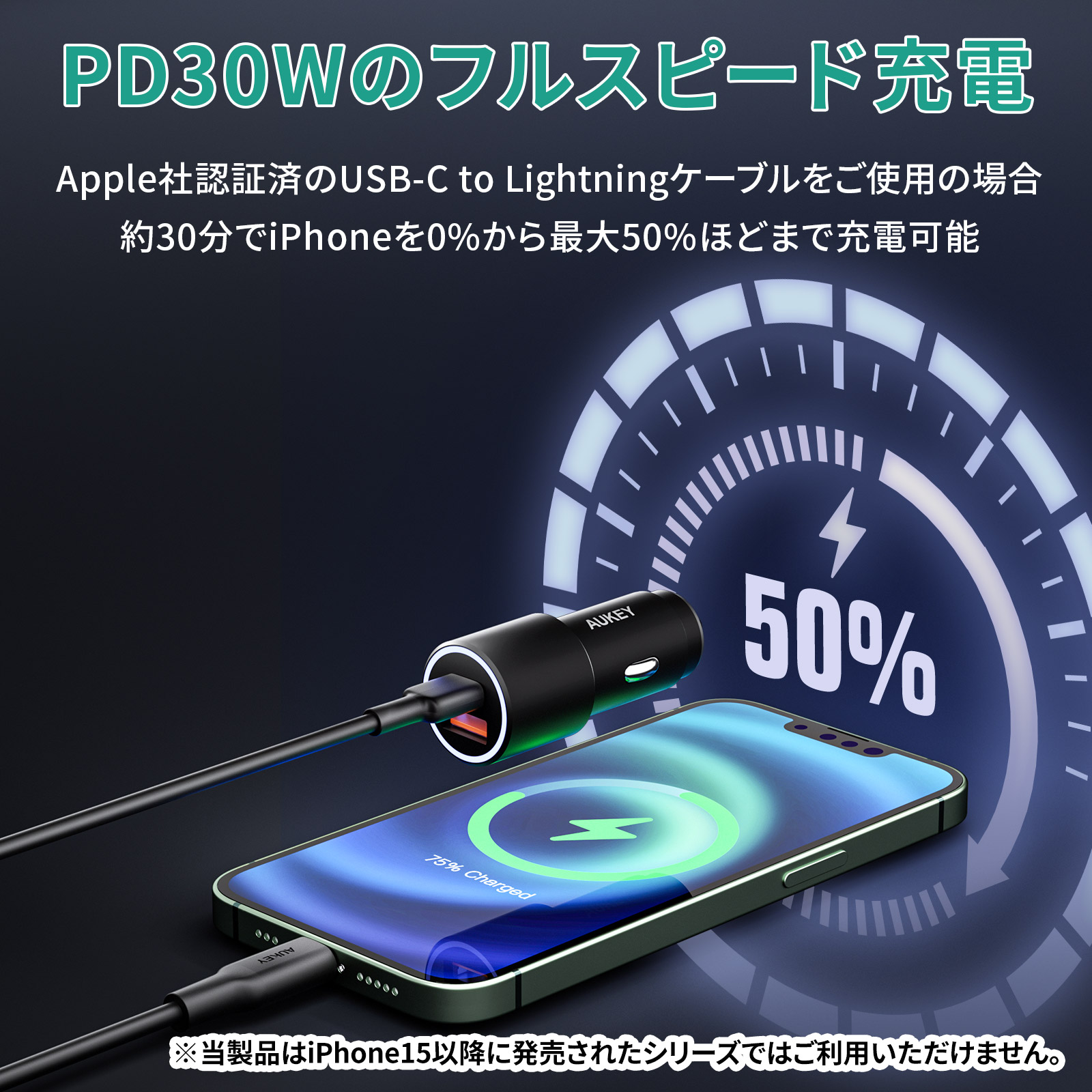 シンプルでスッキリしたデザインのボディにUSB-AとUSB-Cの2ポートを搭載した小型軽量なカーチャージャー。さまざまなUSB機器への充電にご使用できます。PD3.0とQC3.0の2つの急速充電規格に対応し、2ポート合計で最大48W(30W+18W)の高出力で2台の機器への同時充電が可能です。通電時はペールパープルのLEDライトが点灯し夜間の暗い車内でもUSBポートが容易に視認できます。