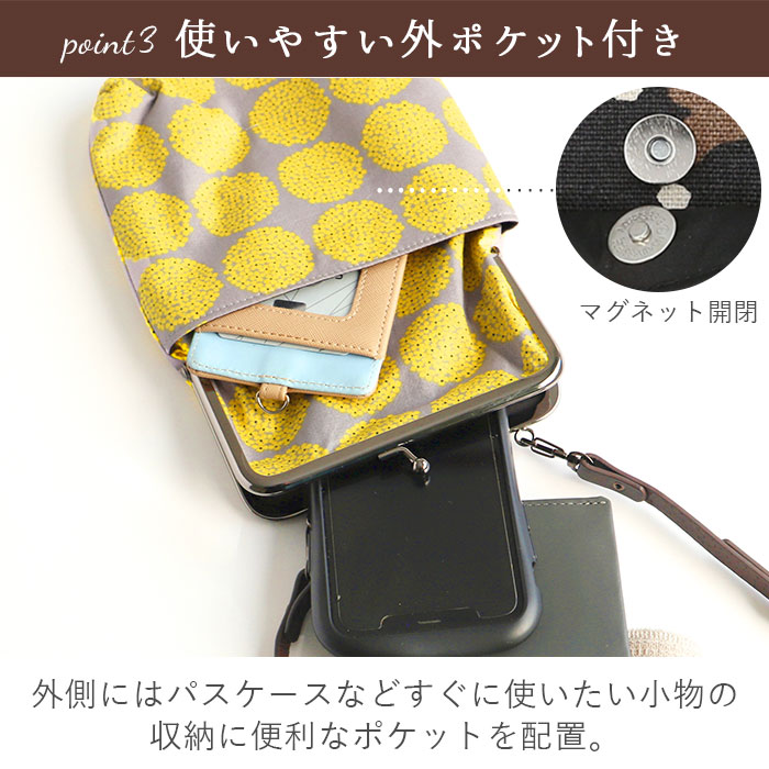 ・外側にはパスケースなど、すぐに使いたい小物の収納に便利なマグネットボタン仕様のポケットを配置。