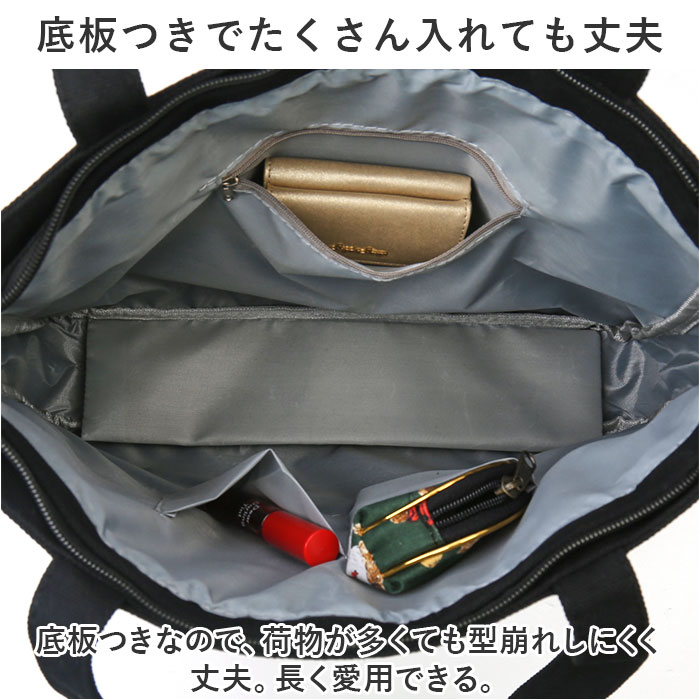・底板つきなので、荷物が多くても型崩れしにくく丈夫。長く愛用できる。