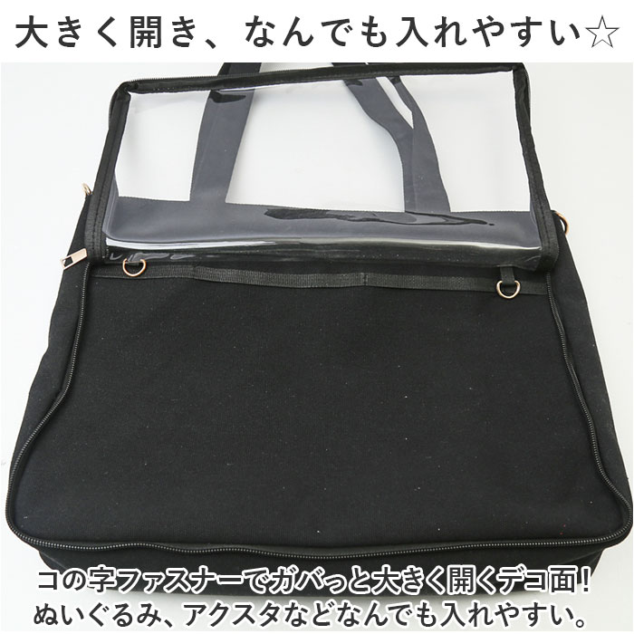 ・コの字ファスナーでガバっと大きく開くデコ面!ぬいぐるみ、アクスタなどなんでも入れやすい。