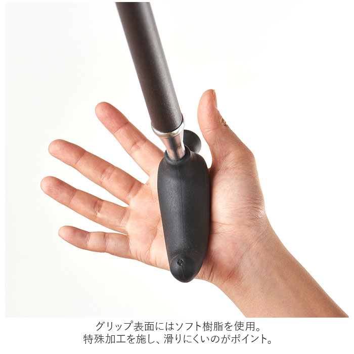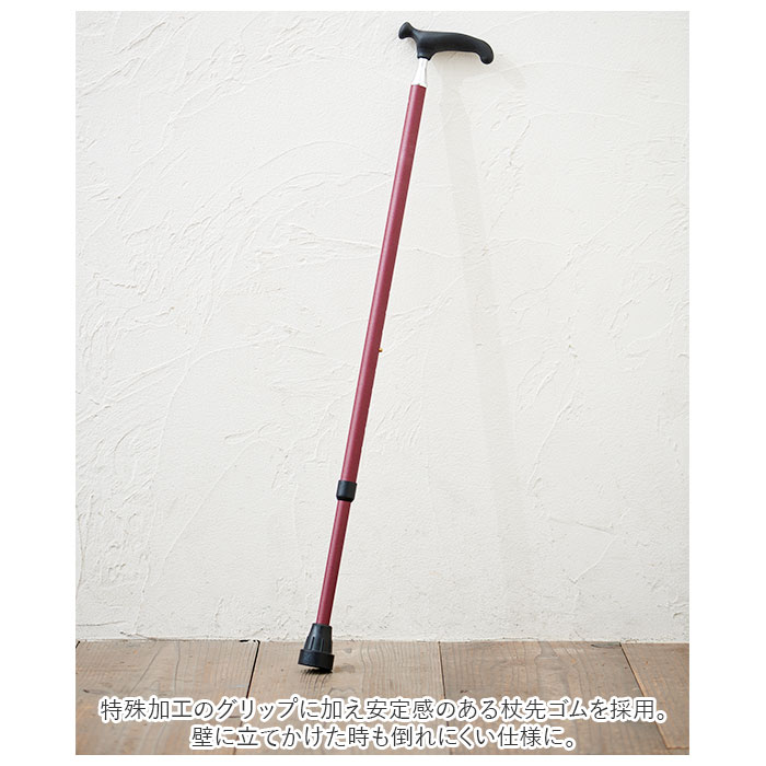 ・特殊加工のグリップに加え安定感のある杖先ゴムを採用。壁に立てかけた時も倒れにくい仕様に。
