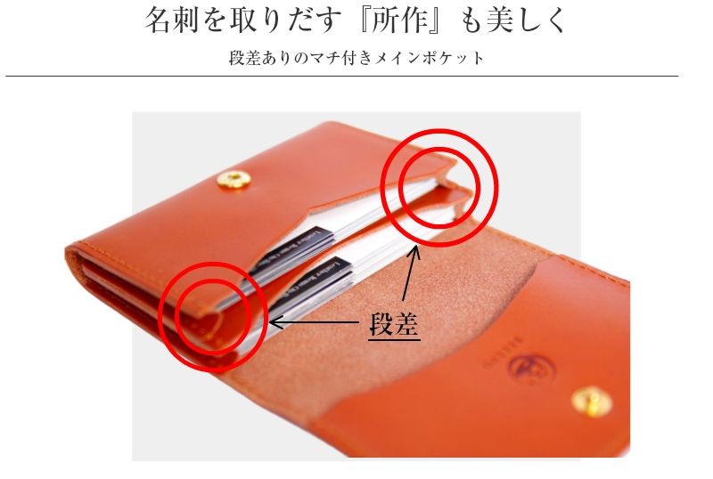 ・前ポケットと後ポケットの高さに段差をつけ、さらにくぼみあるデザインにすることで、奥まで指を入れることなくスムーズに名刺を取りだすことが可能。
