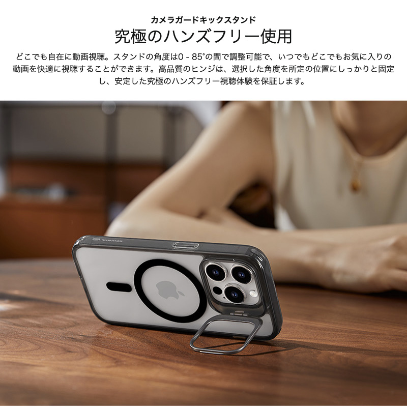 こちらの iPhone14 ケース/iPhone13 ケースにはカメラ部分に隠しスタンドが搭載されて、携帯ケースを単なる飾り物ではありません!ケースを開けるだけでスタンドを完成、角度調整も0 〜85°まで自由にできるので、お好きな角度で動画を楽しむことができます。