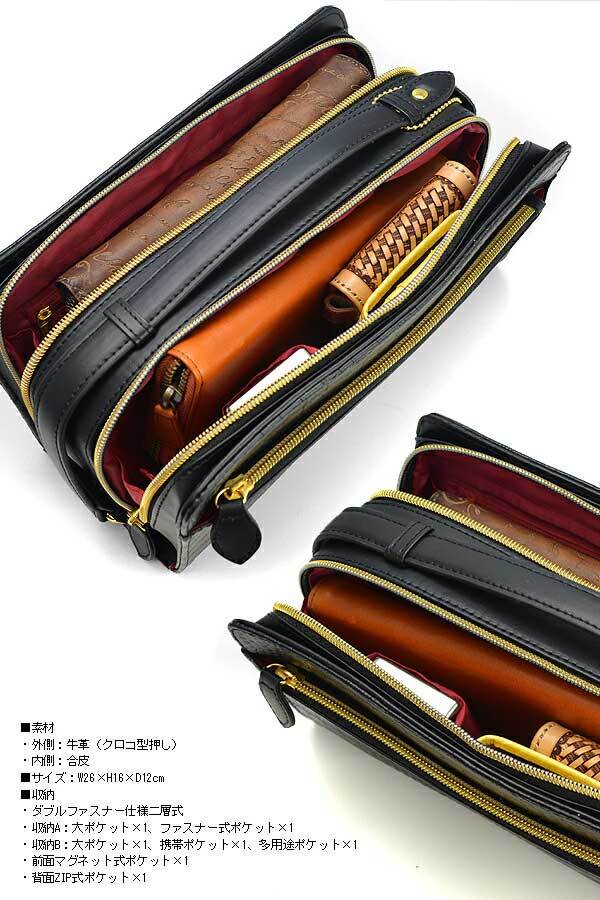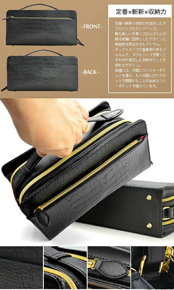 セカンドバッグ ダブルファスナー ブラック 黒 クロコダイル型押し バック かばん カバン 鞄 レザー 牛革 牛皮 本革 本皮 送料無料 RSX-03-CRC