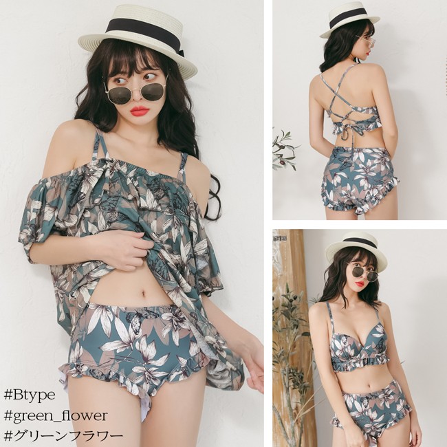 ビキニ 水着 レディース 3点セット 体型カバー 花柄 かわいい 大人 ワンピース 大きいサイズ ママ水着 ハイウエスト セクシー 8367