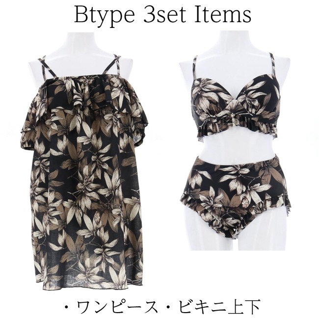 Bタイプはオフショルダーのミニワンピースがセットに♪トップスは胸下のフリルやバッククロスでスタイルアップ!ハイウエストのボトムや袖ありのワンピースが体型カバー力も抜群!