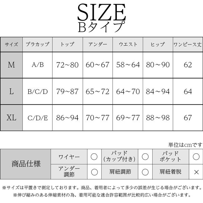 ブラカップ:B/C/D トップ:79〜87 アンダー:65〜72 ウエスト:64〜70 ヒップ:84〜94 ワンピース丈:64