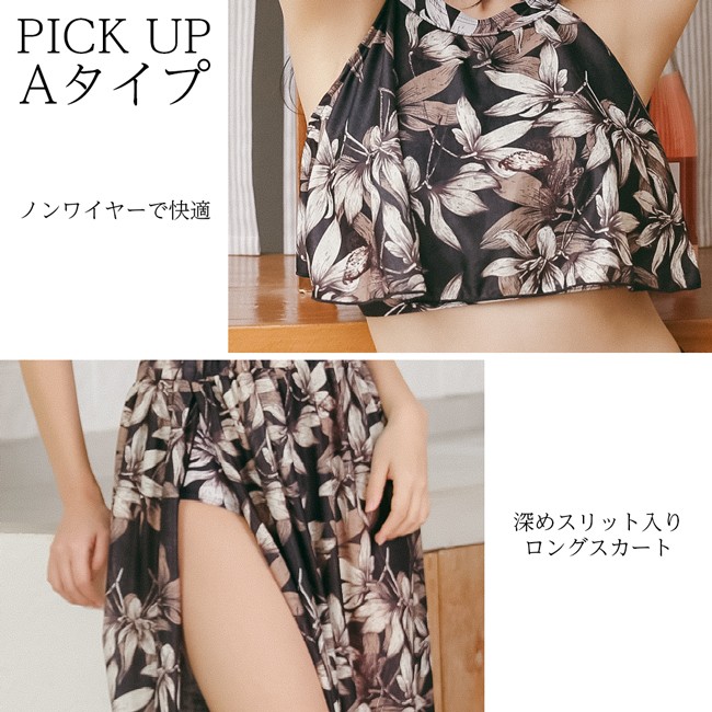 Aタイプはトップスがホルターネックになっていてカップもノンワイヤーで快適!深いスリットが入ったロングスカートがセットになりエレガントな印象に。