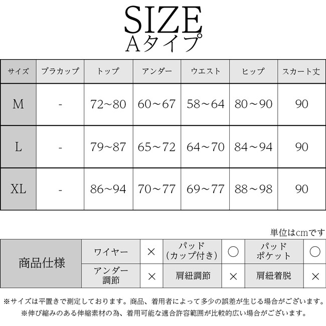トップ:79〜87 アンダー:65〜72 ウエスト:64〜70 ヒップ:84〜94 スカート丈:90