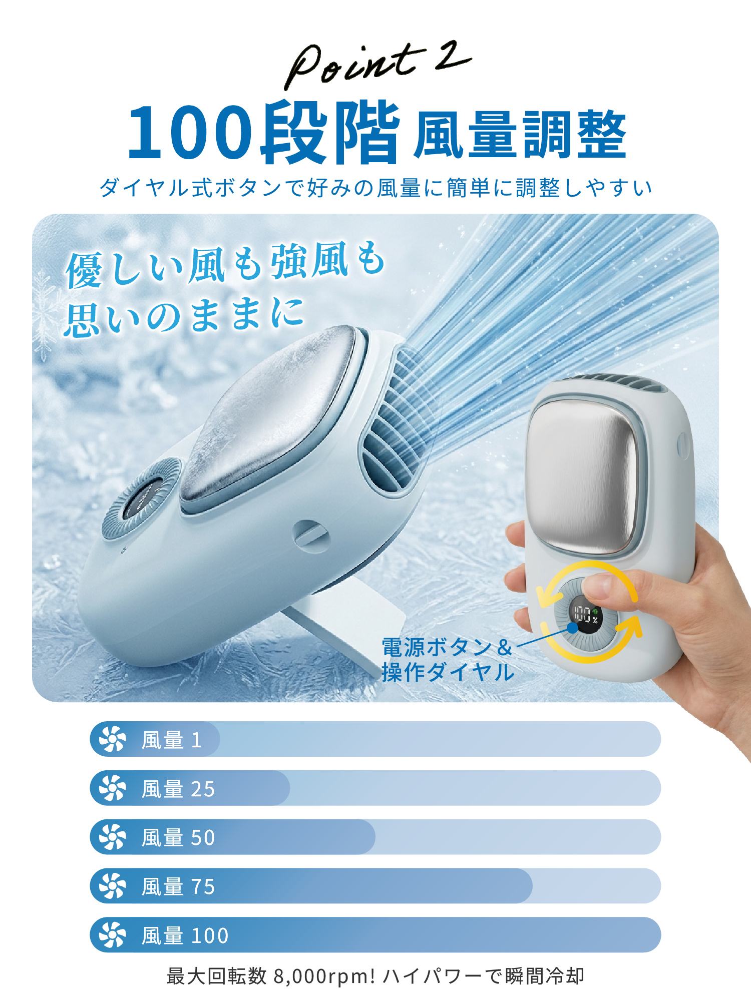 ・1〜100段階の細かな風量調整で、自分好みの風を自在にコントロール