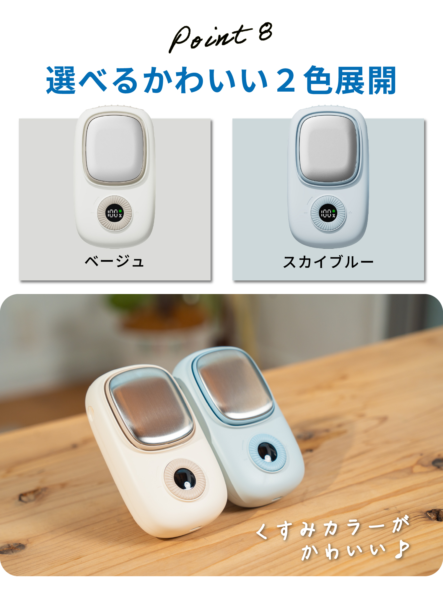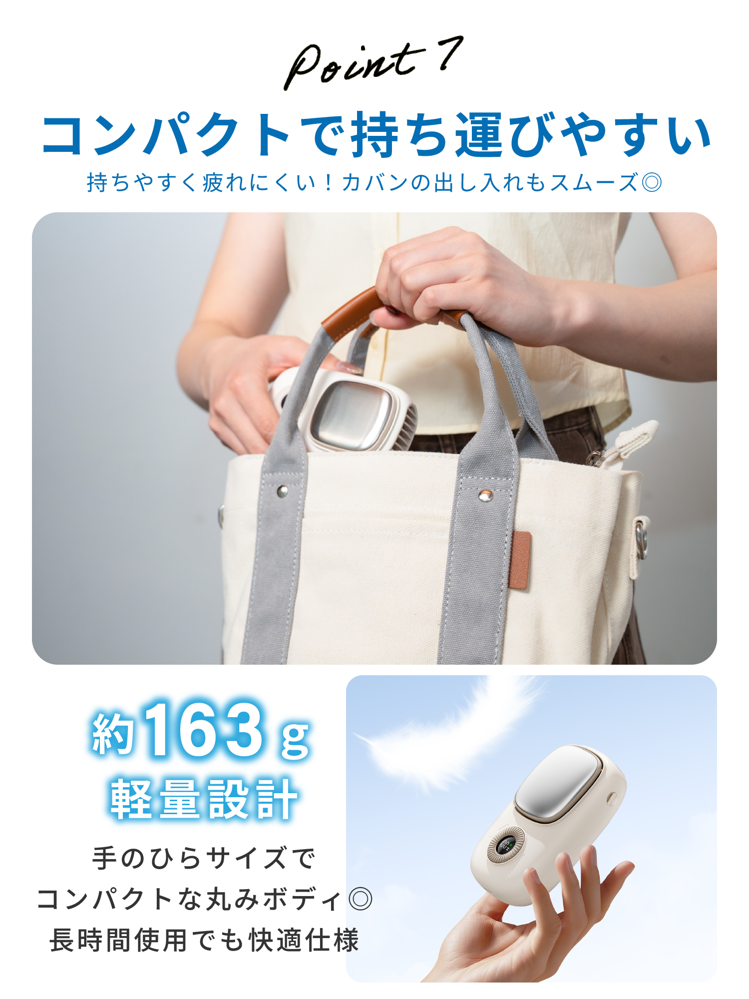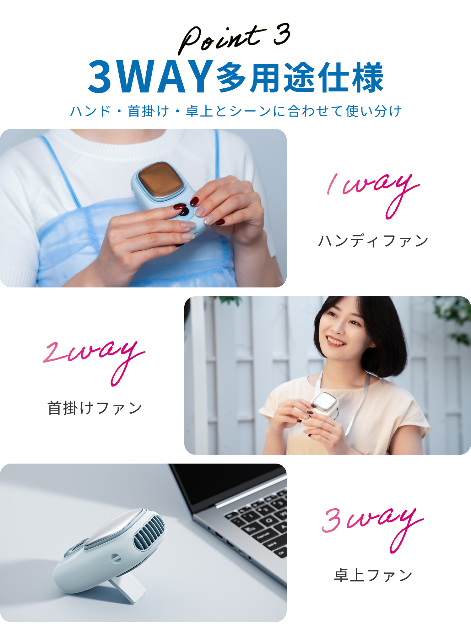 A.手持ち・首掛け・卓上の3WAY仕様で、外出先でもオフィスや自宅でも快適にお使いいただけます。
