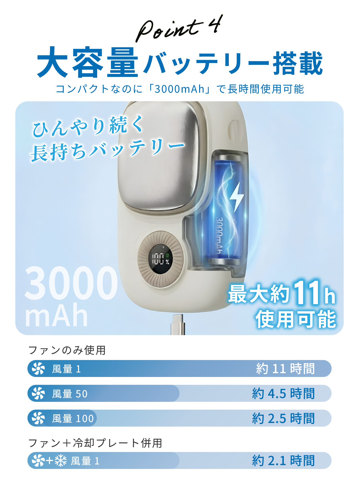・3000mAh大容量バッテリーで最大約11時間連続使用可能