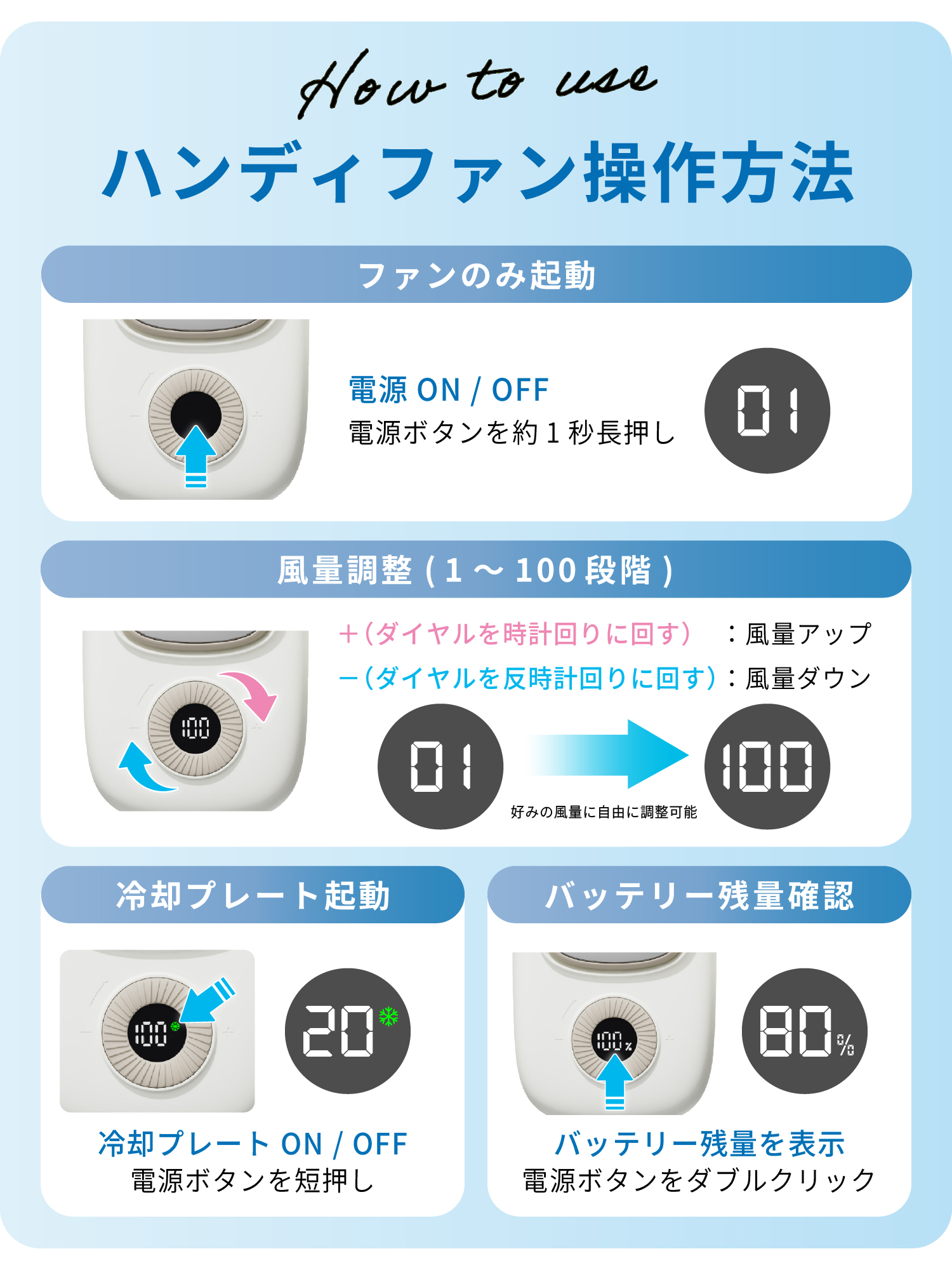 ・ダイヤルを回すだけで風量調整、ボタンひとつで冷却ON/OFFの簡単操作