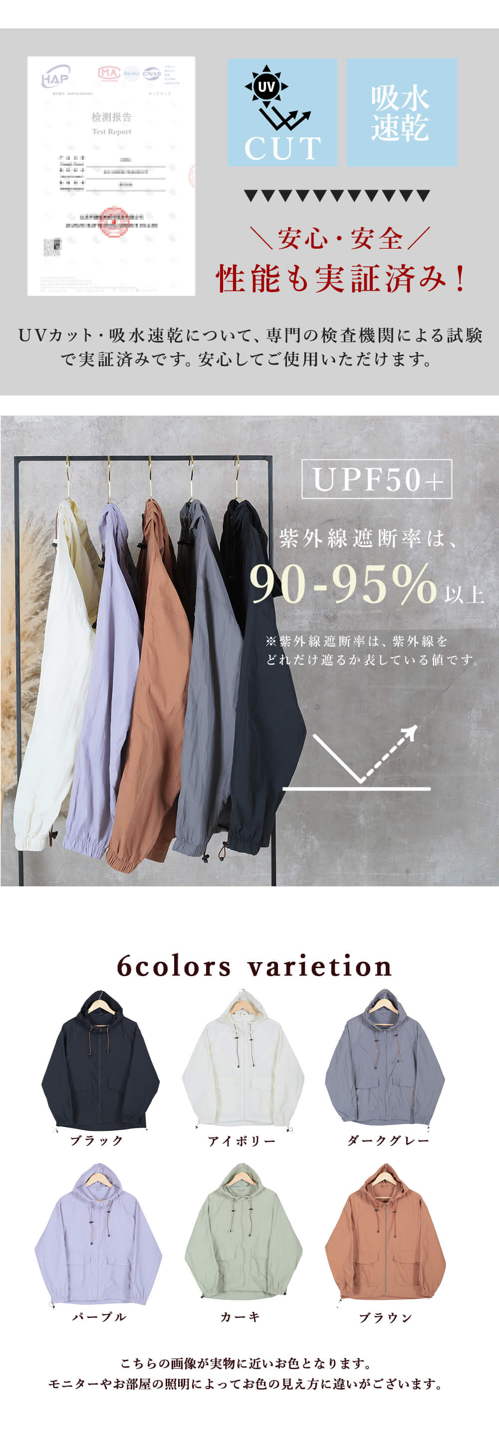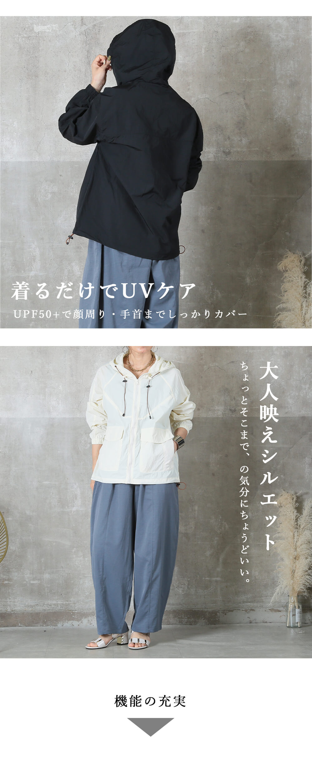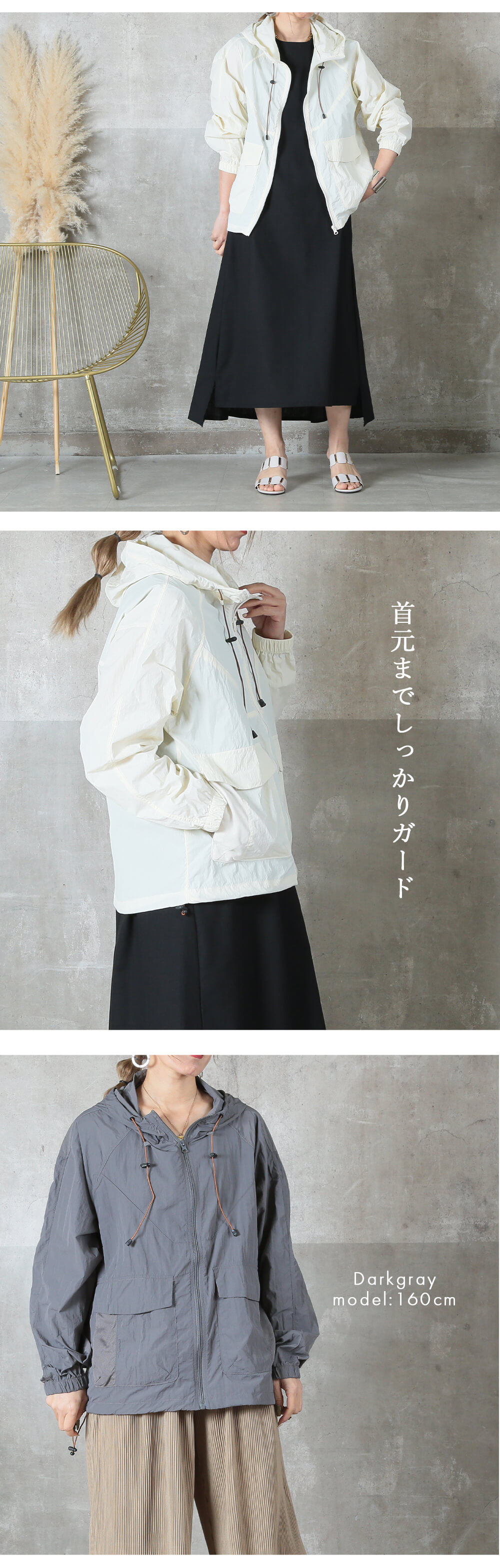 UPF50+で顔周り・手首までしっかりカバー。