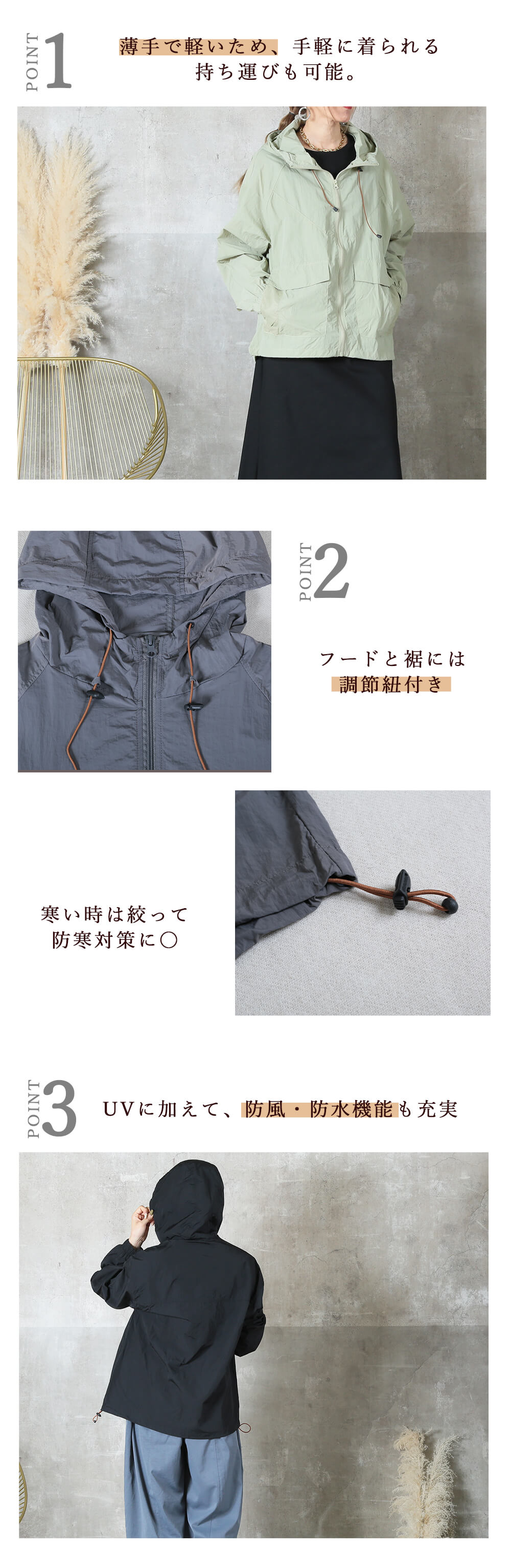 防風・撥水・軽量素材で、