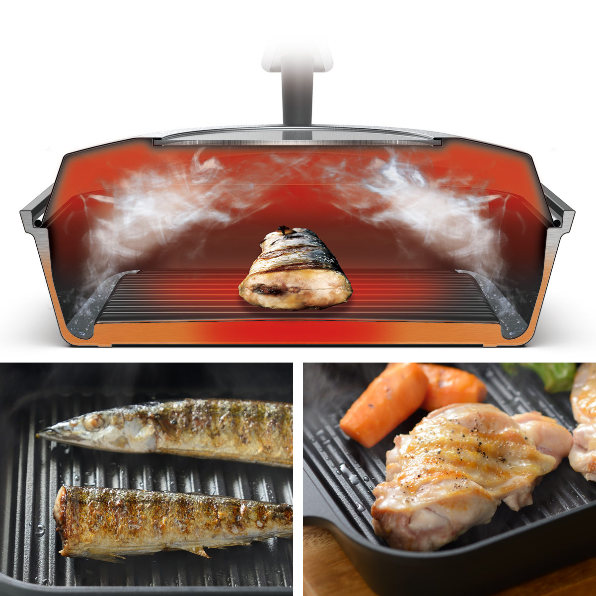 ●「蒸す」と「焼く」のハイブリット調理で魚も肉もふっくらとやわらかい食感に仕上げるスチームクッカーです。