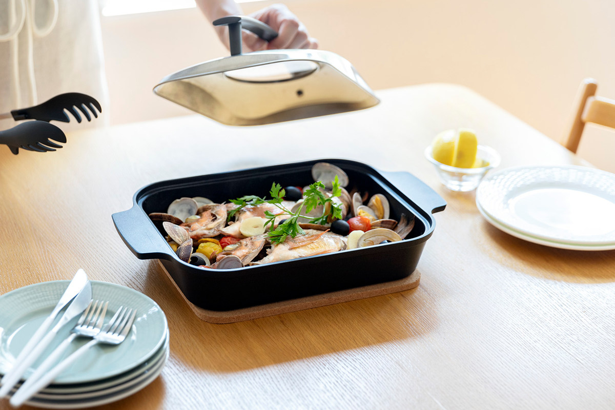 落ち着いた色味でキッチンに映える、シンプルでスマートなデザインです。そのまま食卓にも並べられるデザインなので、家族での食事やパーティーにもおすすめです。