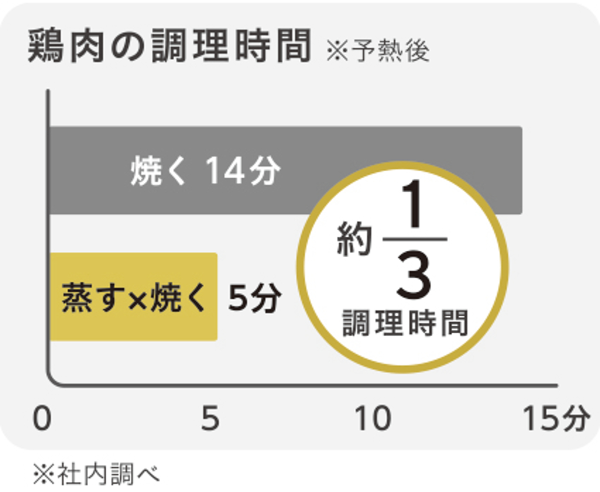 高温の水蒸気を内側に満たすことで熱効率がアップするため、グリルやフライパンよりも大幅に時短で調理できます。