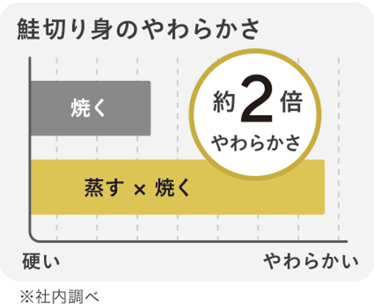 焼きすぎると身が硬くなり、パサパサしがちな焼き魚も「蒸す×焼く」なら水分を逃さず、ふっくら柔らかい食感に仕上がります。