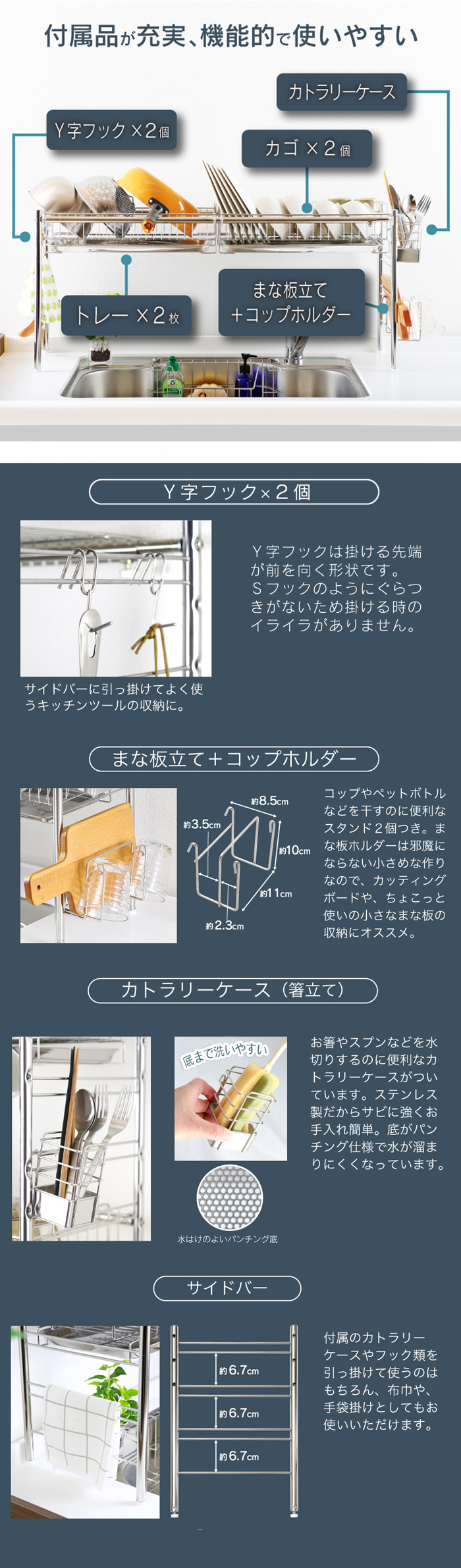 本体フレーム・水切りカゴ・カトラリー・Y字フック・まな板コップホルダー:18-8ステンレス