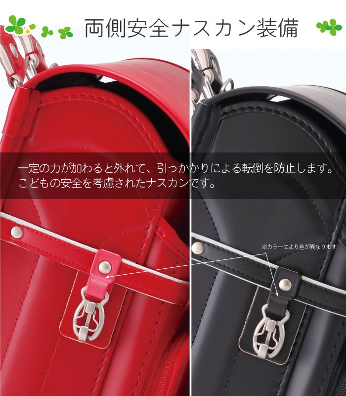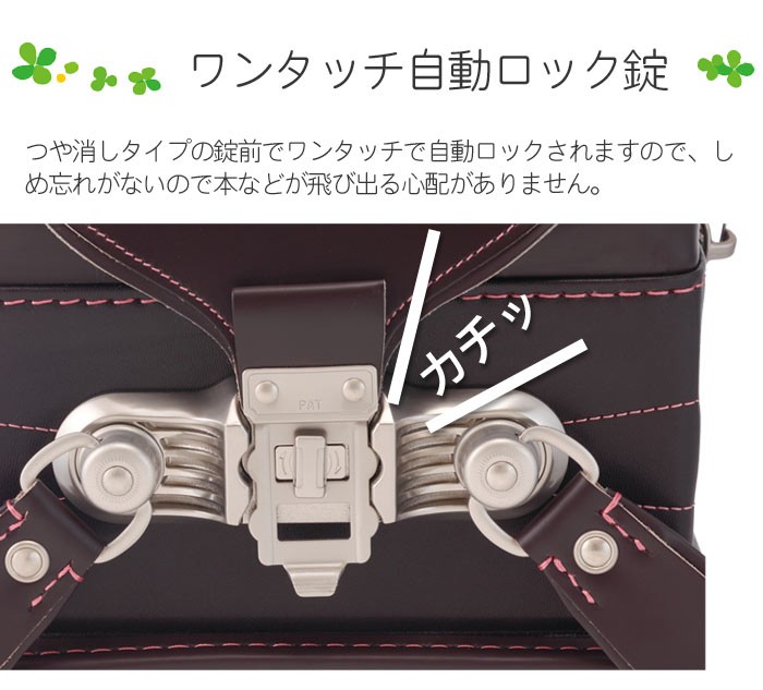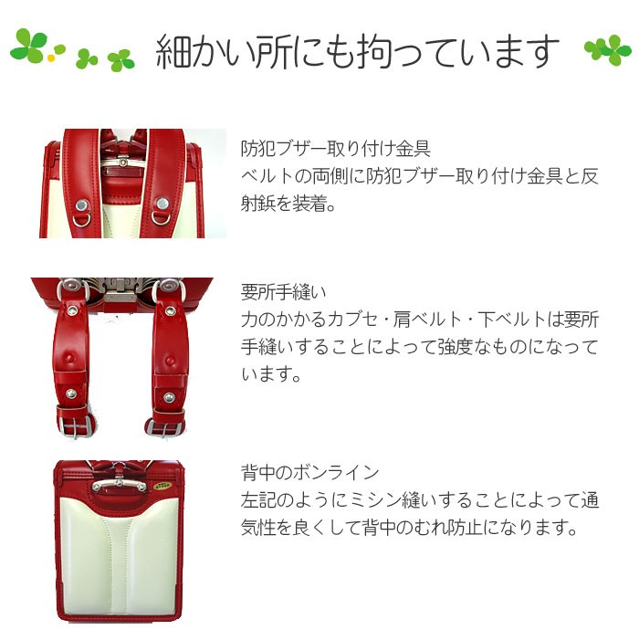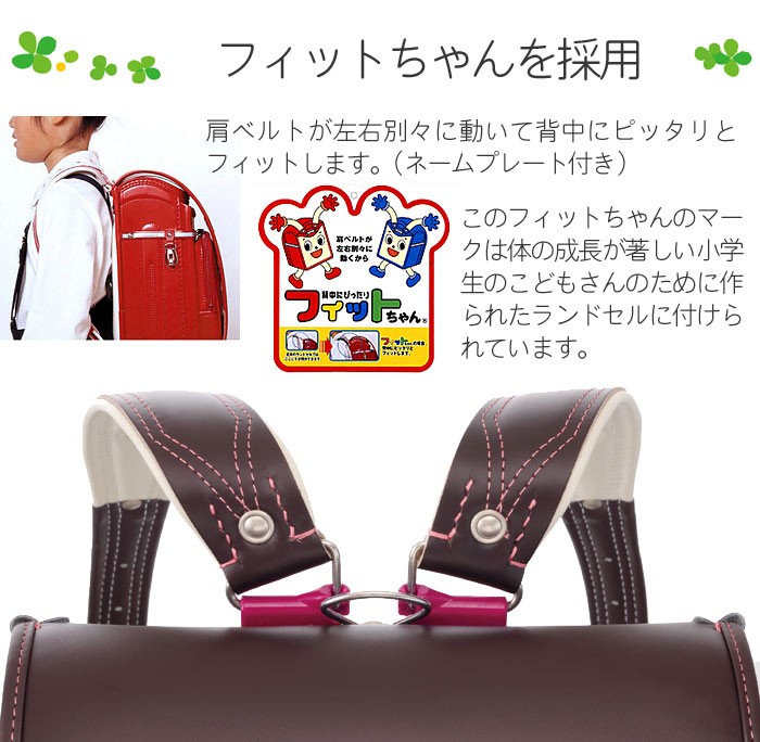 職人が「手作り」にこだわって47年!!素材から小さな部品までひとつずつ心を込めて丁寧に作られていますので、安心・安全で丈夫なランドセルです。体の成長が著しい小学生の子供のために作られたランドセルは、肩ベルトが左右別々に動いて背中にピッタリとフィットします。また、錠前部はワンタッチで自動ロックされますので、閉め忘れを防ぎ、本などが飛び出る心配がありません。他にも、夜道でも車のライトに反射する反射鋲、軽量なものをぶら下げられるナスカン・Dカン、ダブルファスナー付きのワイドポケット等、随所にこだわりが隠されています。小学生の子供の背中にぴったりフィットする「フィットちゃん」を使用しています。かつぎやすさ・軽さが特徴で、背中にぴったりフィットするので子供に人気があります。入学から6年間、小学校で使用しますので、子供の成長に合わせて使用できるランドセルのフィットちゃんを選ぶ方が多くいらっしゃいます。人気ブランド「フィットちゃんランドセル」です。