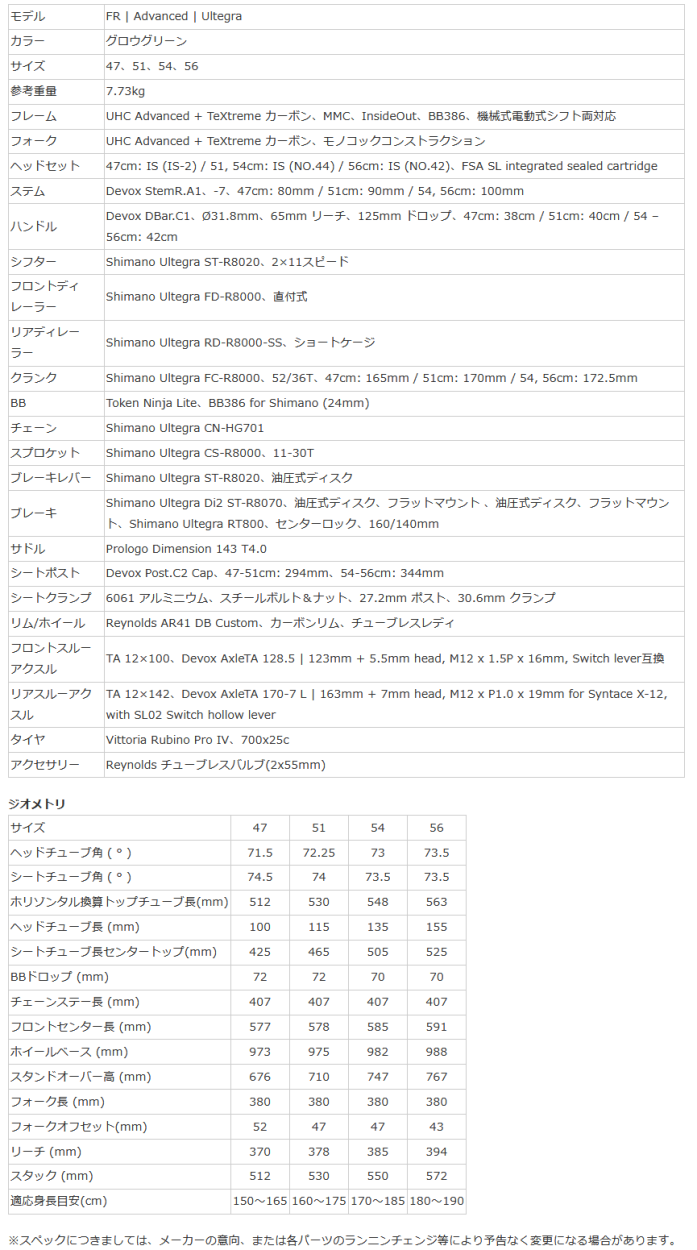 Shimano Ultegra FC-R8000、52/36T、47cm: 165mm / 51cm: 170mm / 54, 56cm: 172.5mm