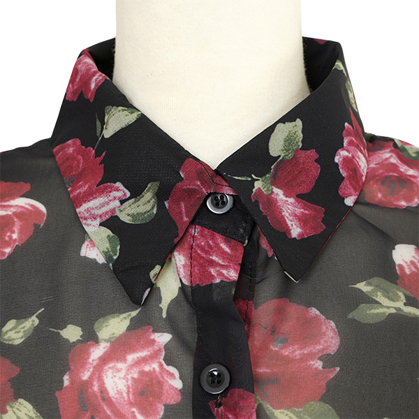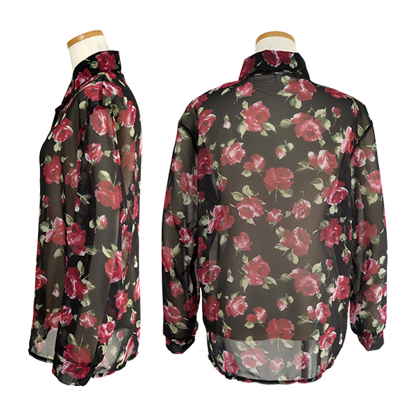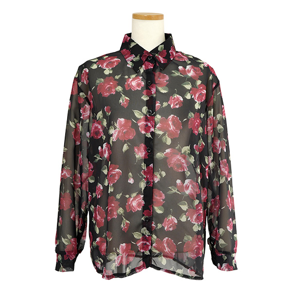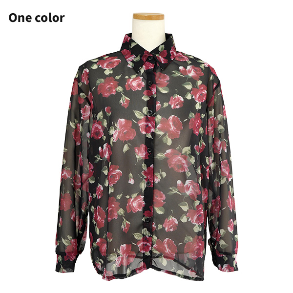柄シャツ バラ柄 バラ ローズ 花柄 花 フラワー シアー シースルー シフォン ブラック 黒 レッド ワインレッド 赤 エレガント 長袖 オーバーサイズ 韓国