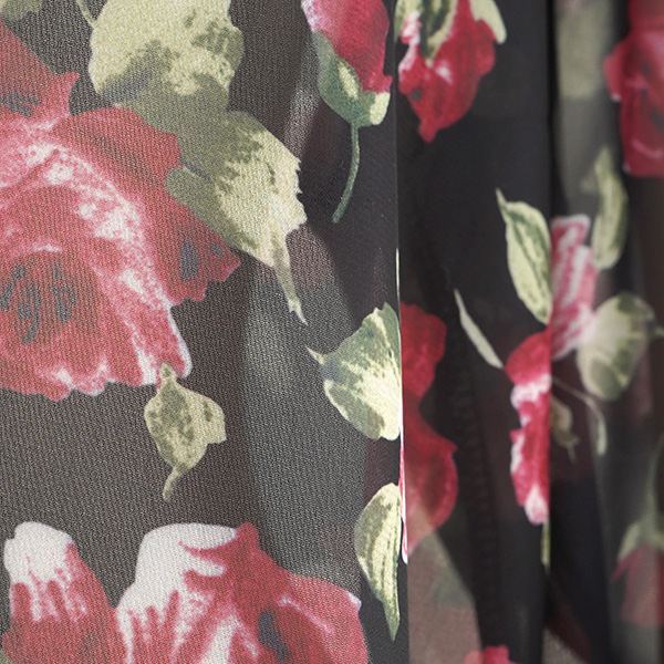黒地にワインレッドのローズ柄が映える、センシュアルな長袖シャツブラウス。