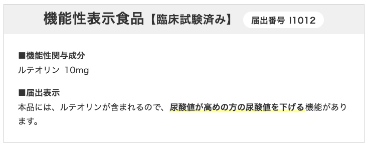 本品には、ルテオリンが含まれるので、尿酸値が高めの方の尿酸値を下げる機能があります。