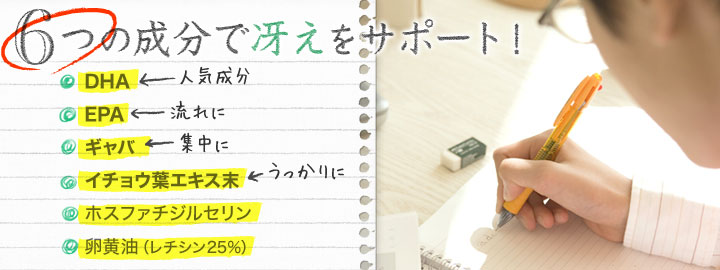DHAやPS、イチョウ葉エキス、ギャバなど6つの成分が複合的に冴えをサポートするサプリメントです。仕事に勉強に頑張りたい、もの忘れが気になり始めたなど、冴えや思考・集中が気になる方をバックアップ。6つの成分が、それぞれはたらきかけ“さえざえ”な毎日を応援します。