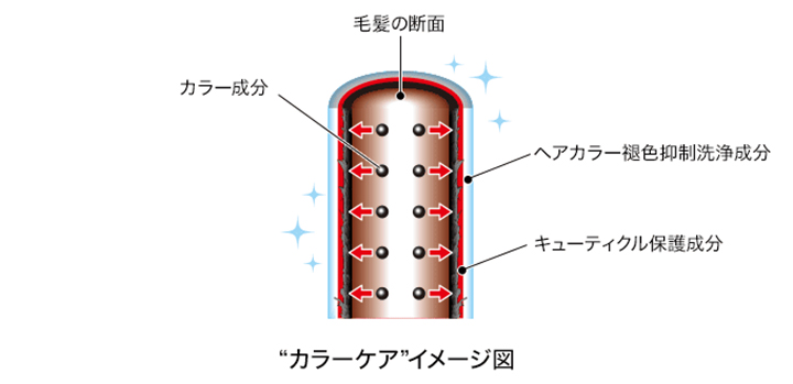 ヘアカラーの色あせの大きな原因は、じつは毎日のシャンプーにあります。そこで、洗髪時の色あせを抑える洗浄成分※に加え、今回新たに、カラー成分の流出をくい止めるキューティクル保護成分を配合しました。