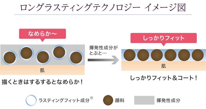 実力派のロングラスティングテクノロジー密着感と持続力を同時に叶える、いいとこどりの揮発タイプペンシルを採用。揮発性成分がとぶことで、顔料が肌にしっかりと定着し、汗・皮脂・摩擦に強いロングラスティング力を実現しました。さらに、ペンシル・パウダーともに配合されたラスティングフィット成分※が、仕上げたての美しさを長時間キープします。